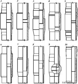 Рис. 5 Примеры соединения труб НКТ зарубежного производства 2.3 Применение НКТ Наиболее распространённое применение НКТ в мировой практике нашло при штанговом насосном способе добычи нефти, который охватывает более 2/3 общего действующего фонда. В России станки-качалки выпускаются по ГОСТ 5866-76, устьевые сальники - по ТУ 26-16-6-76, НКТ - по ГОСТ 633-80, штанги - по ГОСТ 13877-80, скважинный насос и замковые опоры - по ГОСТ 26-16-06-86. Возвратно-поступательное движение плунжера насоса, подвешенного на штангах, обеспечивает подъем жидкости из скважины на поверхность. При наличии парафина в продукции скважины на штангах устанавливают скребки, очищающие внутренние стенки НКТ. Для борьбы с газом и песком на приеме насоса могут устанавливаться газовые или песочные якоря.