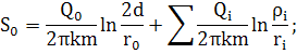 S0= Для t=3 сут, согласно таблице 1, учитывается влияние скважины 1 и скважины 2/, но режим неустановившийся. С учетом того что имеем расчетную схему в виде реки (Н=const), то отображенная скважина задается как нагнетательная (-Q0),тогда: S0=