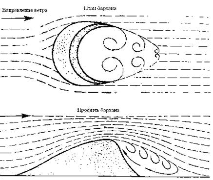 Эоловые пески формируются, как правило, за счет перевевания отложений аллювиального, дельтового, пролювиального, морского, озерного, флювиогляциального генезиса [6]. Формы песчаного рельефа весьма разнообразны. Их можно объединить в 4 основных класса: Барханы, барханные цепи, дюны – это седловидные (полумесяцеобразные) формы, они асимметричны, имеют пологие наветренные и крутые подветренные склоны, ориентированные поперек к господствующему направлению активных ветров (рисунок 3). Линейные гряды с двумя симметричными склонами осыпания, гряды протяженные, часто ветвящиеся и извилистые. Эти формы ориентированны продольно к господствующему направлению активных ветров. Пирамидальные (звездообразные) и куполовидные (сводовые) дюны. Эти формы радиально симметричные без ясно выраженной связи с направлением господствующих ветров. Сложные группы форм с образованиями разной симметрии и ориентированности по отношению к господствующим ветрам. Эоловые формы рельефа встречаются на песчаных равнинах Средней Азии. На Русской равнине есть только одна крупная песчаная пустыня с эоловыми формами. Это Рын-Пески в Прикаспии между Волгой и Уралом [2].