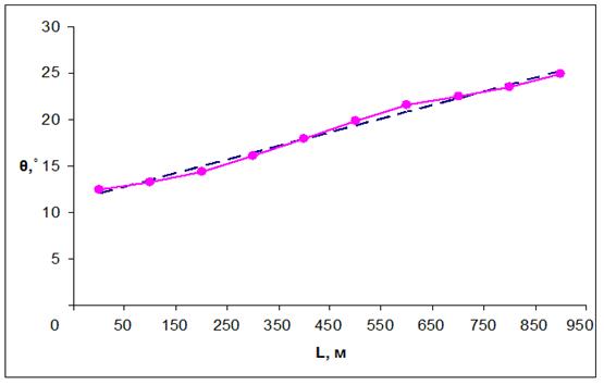 На основании проведенных расчётов построены эмпирический (по данным столбцов li и θi табл. 2) и теоретический (по корреляционному уравнению) графики зависимости зенитного угла от глубины скважины (рис. 1).