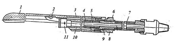 Рис. 6. Схема кинематическая инклинометра ИОК-42 конструкции ВИТР. 1 – электродвигатель; 2 – муфта сцепления; 3 – винтовая пара; 4 – кулиса; 5 – уравнительная пружина; 6 – компенсационная пружина; 7 – фиксатор; 8 – подвижная вилка; 9 – измерительная сфера; 10 – фрагмент защитного колпачка Приводом всех деталей арретирующего механизма служит электродвигатель 1 типа ИДР-6, который работает по команде, поступающей от таймера. По первой команде через муфту сцепления 2 вращение передается на винтовую пару 3, где оно преобразуется в поступательное движение. Через кулису 4 отводится толкатель, подпружиненный уравнительной пружиной 5, а компенсационная пружина б с помощью фиксатора 7 отводит вилку 8 от купола защитного колпака 10 и одновременно освобождает измерительную сферу 9. По второй команде полярность питающего напряжения меняется на обратную, и происходит арретирование измерительного узла чувствительного элемента. Таймер – чувствительный элемент инклинометра в процессе хранения, транспортирования и спуска находится в заарретированном состоянии, что обеспечивает надежность его показаний и долговечность работы инклинометра. Временные интервалы цикла измерения обеспечиваются таймером. Таймер позволяет устанавливать время задержки, необходимое для выполнения вспомогательных работ и спуска инклинометра до точки измерения. По истечении времени задержки автоматически включается двигатель в режим разарретирования (30 с), далее происходит остановка двигателя (1 мин) для установки и успокоения деталей чувствительного элемента, и затем снова происходит включение двигателя (30 с) в режим арретирования. Таймер представляет собой печатную электронную плату с пятью движковыми переключателями (S1 – S5) для установки необходимого времени задержки и тумблера включения питания инклинометра. Блок питания обеспечивает автономное питание инклинометра и представляет цилиндрический контейнер из диэлектрического материала. В качестве элементов питания используют сухие элементы типа А343 (шесть штук), которые обеспечивают напряжение ± 4,5 В. Возможно использование других источников питания, обеспечивающих необходимое напряжение, например аккумуляторов типа Д-026Д или аккумуляторных батарей типа НКГЦ-0,45-1 (НКГЦ-1,8-1). Инклинометры МИ-42У и МИ-ЗОУ Инклинометры МИ-42У и МИ-ЗОУ конструкции «Востказгеология» имеют аналогичное конструктивное устройство. · инклинометр МИ-42У обеспечивает измерение в одной точке пространственного положения скважины диаметром 46 мм и более до глубины 3500 м; · инклинометр МИ-30У может использоваться в скважинах 36 мм и более и, кроме того, для измерения скважин, буримых комплексами ССК-46 и больших диаметров при спуске прибора внутри колонны бурильных труб без подъема последних из скважины (рис. 7). Инклинометр МИ-42У состоит из следующих основных частей: · измерительных узлов (0 – 90 ) и (0 – 5 ) · часового фиксирующего механизма · защитной гильзы · заводного ключа. Инклинометр МИ-ЗОУ измерительного узла 0 – 5 не имеет. Техническая характеристика данных инклинометров представлена в табл. 6 [5] Таблица 6. Техническая характеристика инклинометров МИ-42У и МИ-ЗОУ