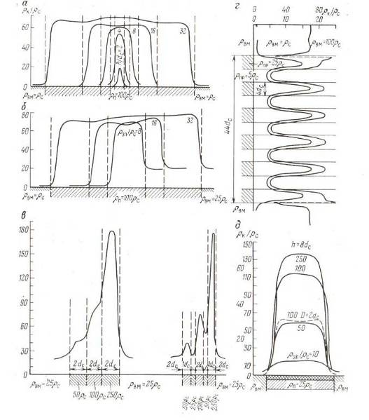 Рис. 5. Кривые сопротивления бокового каротажа для зонда БК-3, dc = 0,165 м: а и б — однородные пласты; в — неоднородный пласт; г—пачка пластов, dc=0,235 м; д — проницаемые пласты с повышающим проникновением ПЖ. 3.3 СНЯТИЕ ОТСЧЕТА рк В ПЛАСТЕ И ВМЕЩАЮЩИХ ПОРОДАХ Рассмотрим пласт на глубине 1412-1413 метров. Снимаем отсчет рк в пласте и вмещающих породах. Отсчёт существенных значений производится по точкам экстремумов pк max или pк min. рк = 200 Ом*м рвм=17 Ом*м Снятое с диаграммы значение pк исправляется сначала за влияние скважины по номограмме, затем за влияние мощности пласта. 3.4 ВВЕДЕНИЕ ПОПРАВОК ЗА МОЩНОСТЬ ПЛАСТА И ВЛИЯНИЕ СКВАЖИНЫ Определение удельного сопротивления пласта рп производят по рк с внесением поправок за диаметр скважины dc. Исправление рк за влияние скважины dc производят с помощью палетки (рис. 6, а). Известно: рк = 200 Ом*м, рс = 0,5 Ом*м, pк/pc = 100, d=0,2 м. Получаем: рк1/рк=1,13; pK1= 1,13*200= 226 Ом*м. Исправленное pK1 за влияние dc против пласта большой мощности pK1= pп. В случае ограниченной мощности пласта h<4dc па показания зонда БК оказывают влияние вмещающие породы рвм. Вычисление поправки за ограниченную мощность пласта и влияния рвм производится с помощью палетки (рис. 40,б). Палетка рассчитана для зависимостей рк2/рк1 от h при различных значениях отношений рк1/рвм, рк2—исправленное рк1 за влияние рВМ и h. При отсутствии проникновения ПЖ в пласт pK1= pп. Известно:рK1=226 Ом*м, рвм=17 Ом*м, рК1/рвм =13,29 ; h = 1 м. Получаем: рк2/рк1= 1,2. рк2= 1,2*226 = 188,3 Ом*м.