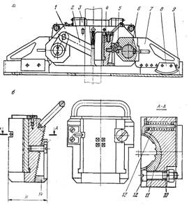 Бурение с ССК можно нести с использованием ведущих труб и наращиванием бурильной колонны через устье скважин. При таком способе проходки в качестве промывочных применяются сальники типа СА или СА-В. При наращивании труб через шпиндель станка съемный керноприемник извлекают и забрасывают через специальные сальники, получившие название проходных (СП). Их особенностью является наличие широкого внутреннего отверстия в стволе, позволяющего осуществлять спуско-подъемные операции с керноприемником. Сальник состоит из корпуса б, имеющего в верхней части внутреннюю" резьбу, с помощью которой осуществляется соединение с крышкой 2. Надежность крепления обеих деталей достигается путем затягивания болта 3. Внутри корпуса на двух радиальных подшипниках 5 вращается' ствол сальника 7. Нижняя часть его соединена с цанговым переходником 8, который платками 9 прижимает бурильную трубу к своему корпусу, препятствуя развинчиванию трубы, имеющей правую нарезку. Набор уплотнительных манжет 4 имеет самоподвижную конструкцию. В крышке корпуса имеется пробка /, которая при бурении фиксируется в закрытом положении. При извлечении съемного керноприёмника пробка снимается и на ее место устанавливается воронка со шлангом, позволяющая отводить изливающуюся жидкость в определенное место. · Гидравлический трубодержатель ТР2-12.5 Трубодержатели предназначены для удержания колонны гладкоствольных бурильных труб на весу при спуско-подъемных операциях и от проворачивания колонны при свинчивании и развинчивании резьбовых соединений. Конструкция трубодержателя обеспечивает предохранение тонкостенных бурильных труб от смятия и повреждения их в месте захвата. Гидравлический трубодержатель ТР2-12.5— рычажно-кулачкопого типа с эксцентричными зажимными плашками, оснащен дистанционным управлением и приводом от гидросистемы бурового станка. В конструкцию трубодержателя входят кулачковые рычаги 7 с опорными накладками 8 для регулирования усилия зажима и кулачковыми накладками 5, стенки 1. оси 6, гидроцилиндр двойного действия 3, опорная плита 9, синхронизатор поворота 2 кулачковых рычагов и обоим 4. Обойма состоит из корпуса 10, эксцентричной плашки 11, упорного болта 12, возвращающего устройства 13 и зубчатого клинового компенсатора износа 14.При зажиме бурильной трубы срабатывает гидроцилиндр 3 и с помощью осей 6 разворачиваются кулачковые рычаги 7,. которые подвигают к трубе обоймы 4, скользящие по направляющим в стенках 1. Происходит сцепление трубы с зубчатыми плашками и труба зажимается с силой, соответствующей фактическому весу колонны. Раскрытие трубодержателя происходит с помощью гидросистемы. Зажимом (и разжимом) управляют дистанционно с помощью распределительного золотника. При развинчивании резьбовых соединений плашки 11, сцепленные с трубой, проворачиваются на некоторый угол относительно корпусов обойм, создавая дополнительный зажим трубы с силой, соответствующей фактическому моменту затяжки резьбового соединения. Износ деталей трубодержателя (зубьев плашек, контактных поверхностей кулачковых рычагов и др.) компенсируется перемещением зубчатого клина относительно зубчатой поверхности обоймы, в результате чего увеличивается размер Н. Это исключает необходимость ремонта деталей трубодержателя.