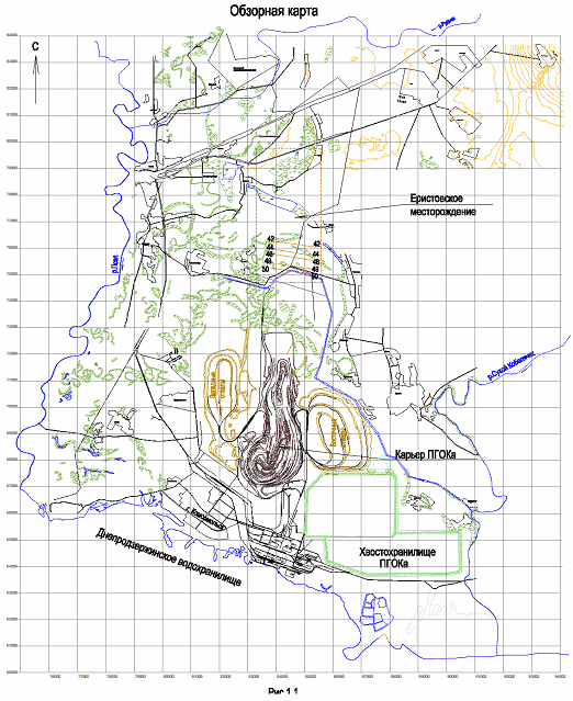 Отчет по практике: Технология работ на железорудном месторождении Еристовского ГОКаОтчет по практике: Технология работ на железорудном месторождении Еристовского ГОКаМинистерство образования и науки Украины Отчёт по практике на ОАО «Еристовский ГОК» Днепропетровск 2010 г. Содержание 1. ХАРАКТЕРИСТИКА ПРИРОДНЫХ УСЛОВИЙ ЕРИСТОВСКОГО ЖЕЛЕЗОРУДНОГО МЕСТОРОЖДЕНИЯ 1.1 Общие сведения 1.2 Геологическое строение 1.3 Особенности геологического строения вскрыши участка первой очереди Еристовского месторождения 1.4 Гидрогеологические условия 1.5 Качественная характеристика поверхностных и подземных вод 2. ОБЩИЕ ТРЕБОВАНИЯ К ОСУШЕНИЮ МЕСТОРОЖДЕНИЯ 3. РАЗРАБОТКА ВАРИАНТОВ СИСТЕМЫ ОСУШЕНИЯ УЧАСТКА ПЕРВОЙ ОЧЕРЕДИ ЕРИСТОВСКОГО КАРЬЕРА НА ПЕРИОД ЕГО ВСКРЫТИЯ 4. ПОРЯДОК ВСКРЫТИЯ МЕСТОРОЖДЕНИЯ. ГОРНО-КАПИТАЛЬНЫЕ РАБОТЫ 4.1 ТЕХНОЛОГИЯ ГОРНЫХ РАБОТ И МЕХАНИЗАЦИЯ ПРОИЗВОДСТВЕННЫХ ПРОЦЕССОВ 5.ОСНОВНЫЕ СВЕДЕНИЯ ОБ ЭЛЕКТРОСНАБЖЕНИИ КАРЬЕРА 1. ХАРАКТЕРИСТИКА ПРИРОДНЫХ УСЛОВИЙ ЕРИСТОВСКОГО ЖЕЛЕЗОРУДНОГО МЕСТОРОЖДЕНИЯ 1.1 Общие сведенияВ географическом отношении Еристовское месторождение расположено в левобережной части Среднего Приднепровья. Административно территория месторождения относится к Кременчугскому району Полтавской области Украины (рис.1.1). Месторождение занимает площадь около 3 км2, имея границу на юге с Лавриковским и на севере с Белановским месторождениями железистых кварцитов. Орография района месторождения носит черты Приднепровской низменности левобережья реки Днепра, представляющей собой слегка всхолмленную и слабо расчлененную эрозионно-аккумулятивную равнину I-III надпойменных террас, осложненную редкой сетью рек, балок, оврагов и болот с общим уклоном поверхности к юго-западу – в сторону Днепра. Гидрографическая сеть района относится к бассейну реки Днепр (протекающего в 6 км к югу от месторождения) и представлена его левым притоком рекой Псел (в 3 км к западу от месторождения). Кроме того, существует ряд мелких стариц с нечетко выраженными долинами, имеющими временный водоток. Климат в районе месторождения умеренно континентальный. Максимальная температура воздуха – в июне (до 40о), минимальная – в январе (до -30о). Количество дней с температурой ниже нуля градусов около110. Максимальная глубина промерзания почвы 1 м. Средняя сумма годовых осадков составляет 450-500 мм, максимальная – 795 мм, выпадающих, в основном, в летний период. Средняя высота снежного покрова не превышает 0,30 м.