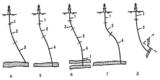 Рис.1. Типы профилей наклонно-направленных скважин: 1 - наклонный участок; 2 - участок набора угла наклона ствола; 3 - прямолинейный наклонный участок; 4 - участок снижения угла наклона ствола. Профиль типа Б отличается от предыдущего тем, что вместо прямолинейного наклонного участка имеет участок 4 естественного снижения угла наклона. Данный профиль рекомендуется применять при больших глубинах скважин. Профиль типа В состоит из пяти участков: вертикального 1, участка набора угла наклона ствола 2, прямолинейного наклонного участка 3, участка снижения угла наклона 4 и снова - вертикального 1. Его рекомендуется применять при проводке глубоких скважин, пересекающих несколько продуктивных пластов. Профиль типа Г отличается от предыдущего тем, что в нем участки 3 и 4 заменены участком самопроизвольного снижения угла наклона 4. Данный профиль рекомендуется применять при бурении глубоких скважин, в которых возможны отклонения в нижней части ствола скважины. Профиль типа Д состоит из вертикального участка 1 и участка набора угла наклона ствола 2. Для него характерна большая длина второго участка. Профиль рекомендуется при необходимости выдержать заданный угол входа в пласт и вскрыть его на наибольшую мощность. Как видно из рис.1, все типы профилей в начале имеют вертикальный участок. Его глубина должна быть не менее 40...50 м. Окончание вертикального участка приурочивают к устойчивым породам, где можно за один рейс набрать зенитный угол 5...6 градусов. Для отклонения скважины от вертикали применяют специальные отклоняющие приспособления: кривую бурильную трубу, кривой переводник, эксцентричный ниппель и отклонители различных типов. В последние годы все большее распространение получают вертикальные и наклонные скважины, имеющие горизонтальные окончания большой протяженности. Это делается для того, чтобы увеличить площадь поверхности, через которую в скважину поступает нефть и соответственно увеличить дебит. Одновременно стало возможным извлекать в промышленных масштабах нефть, считавшуюся ранее неизвлекаемой, вследствие малой мощности и низкой проницаемости продуктивного пласта. Кроме того, горизонтальное окончание скважин располагают в пласте выше подошвенной воды, что позволяет продлить период безводной эксплуатации. 3. Способы наклонно-направленного бурения на нефть и газ Существуют два способа наклонно-направленное бурение на нефть и газ. Первый (распространён в США) представляет собой прерывистый процесс проводки скважин c использованием роторного бурения (применяется c нач. 20в.). При этом способе c забоя скважины долотом меньшего диаметра, чем диаметр ствола скважин, забуривается углубление под углом к оси скважины на длину бурильной трубы (рис.2) c помощью съёмного или несъёмного клинового либо шарнирного устройства (рис. 3, рис. 4).
