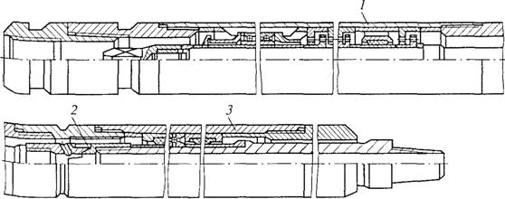 Рис. 8. Турбинный отклонитель ТО-2: 1 — турбинная секция; 2 — шарнирное соединение; 3 — шпиндельная секция Турбинные отклонители имеют следующие преимущества: кривой переводник максимально приближен к долоту, что увеличивает эффективность работы отклонителя; значительно уменьшено влияние колебания осевой нагрузки на величину отклоняющей силы на долоте, что позволяет получить фактический радиус искривления, близкий к расчетному. Недостаток турбинных отклонителей — малая стойкость узла искривленного соединения валов нижнего и верхнего участков отклонителя. Эксцентричный ниппель представляет собой отклонитель, выполненный в виде накладки, приваренной к ниппелю турбобура. Применяется этот отклонитель при бурении в устойчивых породах, где отсутствует опасность заклинивания или прихвата бурильной колонны. Упругий отклонитель состоит из специальной накладки с резиновой рессорой. Накладка приваривается к ниппелю турбобура. Этот отклонитель применяют при бурении в породах, где эксцентричный ниппель не применим из-за опасности прихватов. Механизм искривления — это отклонитель для бурения наклонно-направленных скважин электробуром. В таких механизмах валы двигателя и шпинделя сопрягаются под некоторым углом, что достигается применением зубчатой муфты сцепления. Многозабойное бурение - вид наклонно-направленного бурения, включающий проходку основного ствола c последующим забуриванием и проходкой в его нижней части дополнительных стволов, пересекающих геол. структуру. Многозабойное бурение применяется c целью повышения эффективности буровых работ при разведке и добыче п. и., достигаемой за счёт увеличения доли полезной протяжённости стволов скважин. Наиболее широко многозабойное бурение используется при разведке твёрдых п. и. При разработке нефтяных месторождений. Многозабойное бурение принято называть разветвлённо-горизонтальным бурением. Впервые это бурение осуществлено в США (1930). Использование забойных двигателей при многозабойном бурении впервые реализовано в CCCP по предложению A.M. Григоряна, B. A. Брагина, K. A. Царевича в 1949.
