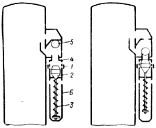Стандартный набор канатных инструментов включает замок для проволоки, грузовые штанги, шарнир, гидравлический и механический яссы. Замок для проволоки ЗП предназначен для соединения проволоки с инструментами, спускаемыми в скважину. Он состоит из корпуса 1, внутри которого размещен ролик 4, соединенный с пропущенной через отверстие в верхнем конце корпуса проволокой. Между роликом и торцом внутренней расточки корпуса помещена пружина 2 для смятения ударов и предохранения проволоки от обрыва при резком ее натяжении (например, при восходящем действии механического ясса). Опорой для нижнего конца пружины служит шайба 3. Для соединения проволоки с замком свободный ее конец пропускают последовательно через отверстие в верхнем конце корпуса, пружину, шайбу и наматывают на ролик два витка, а на стержень проволоки - 12 витков. Затем, вытаскивая проволоку из корпуса, помещают ролик у пружину с шайбой в корпус.