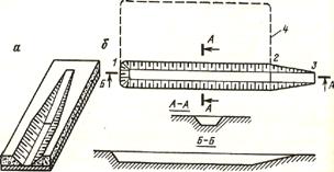А-А Рисунок 2.2 - Общий вид (а) и план (б) капитальной траншеи. Ширина основания капитальной траншеи определяется либо видом карьерного транспорта, либо способом ее проведения. Минимальная ширина основания капитальной траншеи должна быть не менее суммы поперечного размера транспортных средств, безопасных зазоров между ними, поперечного размера площадок, кюветов и других элементов транспортных коммуникаций. Она должна обеспечивать возможность проведения траншеи при принятой технологической схеме и используемом оборудовании (см. раздел 6.8). Глубина капитальной траншеи равна разности отметок устья капитальной траншеи (начало траншеи на поверхности) и вскрываемого рабочего горизонта. При вскрытии одного уступа глубина капитальной траншеи равна высоте вскрываемого уступа. Продольный уклон капитальной траншеи устанавливается в зависимости от вида карьерного транспорта. В зависимости от продольного уклона капитальные траншеи делятся на наклонные и крутые (табл. 2.1). Таблица 2.1 – зависимость уклона капитальной траншеи