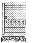 Рисунок 3 - Система подэтажного обрушения с отбойкой руды глубокими скважинами, пробуренными из буровых выработок (а) и штреков скреперования (б), на наклонное компенсационное пространство Отличительная особенность этой системы разработки заключается в том, что отбойка слоев руды, разбуренных из буровых выработок глубокими скважинами, производится не на компенсационное пространство, выполненное в виде камеры (пустоты), а на ранее обрушенную руду или даже пустые породы. Таким образом, при отбойке руды на зажатую среду отпадает необходимость в трудоемкой операции по образованию компенсационного пространства.