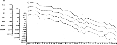 Рис. 3. Геохимические спектры руд мумие ареалов: Сарлыкского (С), Белухинского (Б), Оюмского (О), Чарышскотерехтинского (Чт). 3.5. В Горноалтайской мумиеносной провинции выделяется не менее десятка точек мумиеносности, 24 мумиепроявления и 35 месторождений, по которым была рассчитана логнормальная оценка среднего по ресурсам месторождения Горноалтайской провинции: Ме = 13,5 кг (ε = 3,2; N = 35) при минимальном ресурсе в 1,5 кг и максимальном - 75,8 кг, причем уникальных месторождений с ресурсами более 150 кг пока не обнаружено. Очень крупных месторождений (от 50 до 150 кг) открыто 5, сосредоточены они на юго-востоке провинции в Чарышскотерехтинском ареале, число рудных тел с рядовыми рудами, сложенных в основном первичным мумие – от 10 до 30. Крупных месторождений (от 15 до 50 кг) установлено 14, так же в Чарышскотерехтинском ареале и в местах перекрытий с другими ареалами, число рудных тел, чаще с рядовыми и реже с богатыми и бедными рудами колеблется от 4 до 27. Средних месторождений (от 5 до 15 кг) практически во всех ареалах открыто 10, число рудных тел – от 1 до 9, руды сложены главным образом вторичным мумие, бедные, редко – «восковые» богатые. Мелких месторождений открыто 6, в основном в перекрытиях ареалов друг с другом, число рудных тел не превышает 7, руды сложены вторичным мумие, бедные. Результаты типизации показывают увеличение мумиеносности по юго-восточному траверсу, а также дают представление о характере оруденения провинции: на северо-западе – маломасштабные разграбленные месторождения бедных вторичных руд, к юго-востоку - значительные по ресурсам, уцелевшие месторождения богатых первичных руд. 4. Вышеизложенный комплекс характеристик позволил прогнозировать геологические ресурсы мумие Горного Алтая. Для планирования добычи и переработки руд мумие по категории прогнозных ресурсов Р2 были применены традиционный и машинный методы прогноза. Причем полезные площади были выбраны в компьютерных контурах ареалов, из которых картографически исключались склоны северной экспозиции, выше линии увлажнения, площади рыхлых отложений впадин, зеркала озер, болот и т.д. Традиционный метод основан на определении реальной продуктивности опоискованных эталонных участков и умножения ее на площадь всего ареала, машинный – на логнормальной регрессионной модели формализованного эквивалента регистрационной карты провинции. В обоих методах применялся коэффициент достоверности Кдост., определявшийся экспертно. Расхождение оценок двух методов подсчета составило 5%, что вполне в пределах точности подсчета ресурсов, выполняемых на крупномасштабной топооснове по данным геологоразведочных работ. Достоинством традиционного метода явилось использование реальных цифр масс руд на эталонном участке, что в определенной степени освобождает результаты от субъективных представлений о распределении мумие. Однако введение Кдост. вносит довольно большую долю той же субъективности. Другим относительным недостатком является дифференцированность оценок лишь до уровня размеров ареалов. Существенным условием метода является необходимость проведения специальных полевых работ, что удорожает исследования. Достоинством машинного метода явились бóльшая дифференцированность оценок до уровня площадей склонов и статистичность оценок, сглаживающей неоднородности расп