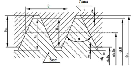 Рис. 4. Основной профиль резьбы d (D) - номинальный диаметр резьбы винта (гайки); d1 (D1) - внутренний диаметр резьбы винта (гайки); d2 (D2) - средний диаметр резьбы винта (гайки); Р - шаг езьбы; a - угол профиля; Н1 - рабочая высота профиля; Н - высота исходного треугольника резьбы.