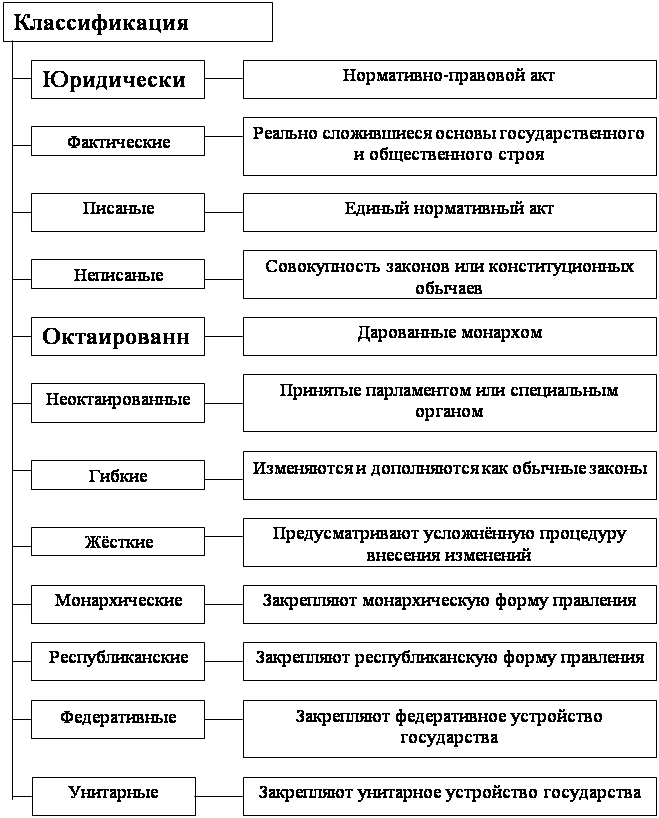 Сущность конституции состоит в том, что она выражает социальный компромисс или согласие, достигаемые в момент ее принятия различными социально-политическими силами по коренному вопросу, который она решает, - ограничение пределов вмешательства государства в жизнь общества и индивидов.[2] Функции конституции. В науке конституционного права принято выделять юридическую, политическую и идеологическую функции конституции. Юридическая функция заключается в том, что конституция является основным источником права, содержащим исходные начала для всей правовой системы. Политическая функция состоит в том, что конституция устанавливает основы организации государственной власти, основы взаимоотношений государства «личности, определяет принципы функционирования политической системы в целом. Идеологическая функция проявляется в способности конституции оказывать влияние на духовную жизнь общества путем распространения и утверждения определенных политических и правовых идей, представлений и ценностей. Форма конституции - это способ организации конституционных норм. По форме конституция может состоять из одного или нескольких нормативно-правовых актов. В большинстве государств конституции представляют собой единый документ (кодифицированные конституции), например Конституция Италии, Основной закон Германии, Конституция Российской Федерации и др. Однако в ряде стран конституции представлены совокупностью нормативно-правовых актов (некодифицированные конституции), в равной мере обладающих высшей юридической силой. Примером может служить Швеция, Конституция которой состоит из трех нормативных актов: Форма правления 1974 г., Акт о престолонаследии 1810 г., Акт о свободе печати 1974 г. Рассмотренные выше конституции наука конституционного права относит к числу писаных. Наряду с писаными встречаются так называемые «неписаные» (частично писаные) конституции. В качестве примера можно привести Конституцию Великобритании, состоящую из парламентских законов, судебных прецедентов и обычаев (конституционных соглашений). Структура конституции - это строение конституции, которое определяется последовательностью расположения ее составных частей. Анализ содержания конституций различных государств показывает, что большинство из них имеют одинаковую структуру, состоящую из преамбулы, основной части, заключительных и переходных положений.[3] Преамбула объясняет цели конституции, исторические условия ее принятия. Положения преамбулы имеют важное политическое и идеологическое значение, выступая в качестве своеобразных ориентиров, способствующих пониманию и применению основных положений конституции. Основная часть конституции содержит нормы, закрепляющие основы конституционного строя, права и свободы личности, систему, принципы организации и деятельности органов государственной власти (в федеративных государствах - федеративное устройство), порядок изменения и пересмотра конституции. В заключительных и переходных положениях, как правило, устанавливается момент вступления конституции в силу, порядок вступления в силу отдельных конституционных норм, которые не могут быть реализованы сразу, порядок и сроки замены прежних конституционных институтов новыми. 1.2 Классификация конституцийДля науки конституционного права важ