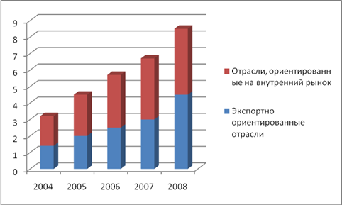 *Источник: [29] Данные, приведенные в таблице 2.2 показывают, что наибольший объем просроченной задолженности на протяжении анализируемого периода среди экспортно-ориентированных отраслей наблюдается в нефтяной промышленности, причем с каждым годом наблюдается ее увеличение. В 2005 году наблюдается рост объемов просроченной задолженности на 12%, который продолжился и в 2006 году – на 13%. В 2007 год нефтяная промышленность улучшила ситуацию, и снизила просроченную задолженность на 11,4%. Однако резкое ее увеличение наблюдается в 2008 году – почти на 20,1%. На втором месте в структуре просроченной задолженности – металлургия. Причем ее объемы с каждым годом растут. Так, ее рост в 2005 году составил 52,6%; в 2006 году – 13,7%. 2007 год так же как и отрасли нефтяной промышленности, металлургии принес спад объемов просроченной задолженности примерно на 37,9%. Замыкает круг лидеров по объемам просроченной задолженности газовая промышленность. В 2004 году она составила – 15 млрд. руб. В 2005 году - возросла на 14,5%, к 2006 году – на 14%. В 2007 газовая промышленность рассчиталась по своим долгам и снизила этот показатель на 9,4%, и сохранила этот уровень в 2008 году (см. табл. 2.2) . Рост объемов просроченной задолженности экспортно-ориентированных отраслей за анализируемый период во многом определен конъюнктурой рынка, объемами продаж, политикой властей в отношении внешнеторговой деятельности. Так, например, на спад объемов просроченной задолженности в 2007 году по всем трем анализируемым отраслям повлияла активная политика федеральных органов власти на заключение международных договоров с Японией и Европой на поставку газа, нефти и изделий из металлов. Многие компании получили возможность реализовать свою продукцию на новом, не занятом рынке, это поспособствовало увеличению скорости оборота оборотных средств и более быстрому получению прибыли. За счет увеличения чистой прибыли, компании погасили свои накопившейся долги [13, с. 25]. Таким образом, можно сказать, что экспортно – ориентированные отрасли российской экономики, ровно так же как и отрасли, ориентированные на внутренний рынок с каждым годом все активнее кредитуются банковским сектором, используя в большей степени заемные средства на обновление производственных фондов, финансирования проектов и т.п. Структура кредитного портфеля отраслей, ориентированных на внутренний рынок представлена на рисунке 2.7.