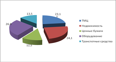 *Источник: [24] Как видно из таблицы 2.5, электроэнергетика на протяжении всего анализируемого периода является явным неплательщиком, увеличивая процент невозврата с каждым годом примерно на 10-12%. На втором месте на протяжении всего анализируемого периода находиться пищевая промышленность, которая в 2005 году увеличила данный показатель на 3,4%, и продолжала увеличивать в последующие года в среднем на 5-6%. Легкая промышленность замыкает тройку лидеров – неплательщиков, но имеет такую же тенденцию роста примерно на 5-6% с каждым годом. Необходимо также отметить ряд факторов, в силу которых многие банки продолжают довольно высоко оценивать риски кредитования. Прежде всего, следует разграничить кредитные риски, вызванные деятельностью предприятий-заемщиков, и кредитные риски, возникающие в работе коммерческих банков. Большинство промышленных предприятий на протяжении последних лет испытывают тяжелые финансовые затруднения, и убытки от результатов их деятельности практически не снижаются. Недостаточная платежеспособность – фактор, определяющий высокий уровень рисков при кредитовании таких предприятий. Кроме того, налоговое бремя зачастую заставляет предприятия вести «двойную» бухгалтерию, что не позволяет банку правильно как оценить его финансовое положение, так и рассчитать уровень кредитного риска [34, с. 24]. Высокие кредитные риски вызваны не только финансовым состоянием предприятий (невысокой рентабельностью и убыточностью). Значительная часть промышленных предприятий не в состоянии производить конкурентоспособную продукцию, реализация которой позволит вернуть выданную ссуду, т.к. страдает их техническое оснащение. Еще один значительный фактор кредитного риска – это отсутствие у заемщиков кредитной истории. Однако, несмотря на плачевную ситуацию с возвратностью кредитов, банки все же продолжают кредитовать реальный сектор экономики и внутренние отрасли в том числе, лишь увеличивая с каждым годом объемы предоставленных кредитов. Это происходит из за того, что предприятия предоставляют банкам вполне надежное, ликвидное обеспечение. Структура видов обеспечения в среднем за анализируемый период отраслей, ориентированных на внутренний рынок представлена на рисунке 2.10. Рис. 2.10. показывает, что наибольший удельный вес в структуре обеспечения занимает оборудование, которое имеет 26,9%. Это объясняется популярностью среди данных отраслей такого вида кредитования как лизинг. При покупке оборудования или транспорта в лизинг – она само выступает в качестве обеспечения.