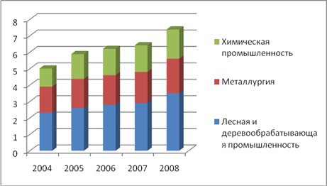 Рис. 2.14.Объемы пророченной задолженности экспортно-ориентированных отраслей Иркутской области млрд. руб.* *Источник: [42]. Исходя из рисунка 2.14 видно, что объемы просроченной задолженности увеличиваются с каждым годом в среднем на 12-15%. Причем самый динамичный рост демонстрирует лесная промышленность, темпы роста которой увеличиваются на 15-18% ежегодно. Металлургия и химическая промышленность достаточно стабильно увеличивают долю просроченной ссудной задолженности, темпы роста которых в среднем за анализируемый период составили 12; 13% соответственно. Относительно низкие темпы роста объемов просроченной задолженности можно объяснить и небольшими объемами предоставленных кредитов в данные отрасли. Чего нельзя сказать о лесной промышленности. Ее бурный подъем в 2007 году потребовал больших вливаний для перевооружения и пополнения оборотных средств. Однако компании не смогли эффективно распорядиться предоставленными ссудами. [31, с. 45].Отрасли, ориентированные на внутренний рынок, так же характеризуются положительными тенденциями в объемах кредитования: Как видно из таблицы 2.6, наибольшие объемы кредитования среди внутренне-ориентированных отраслей Иркутской области сосредоточены в строительстве, причем с ежегодным стабильным ростом, который в среднем составляет 1,1-1,3%. Таблица 2.6 Объемы кредитования отраслей, ориентированных на внутренний рынок Иркутской области, млрд. руб.*