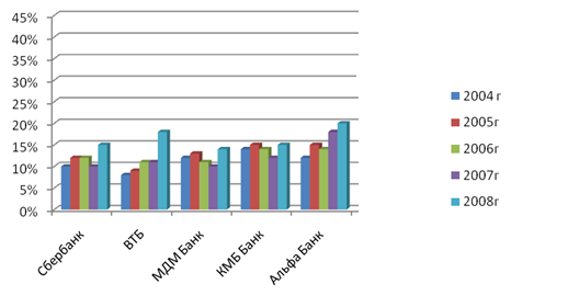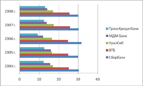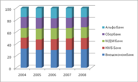 Рис. 2.3.Динамика доли кредитного портфеля различных банков в кредитовании экспортно-ориентированных отраслей, %* *Рассчитано автором по данным [18] Как показано на рисунке 2.3, наибольший удельный вес в структуре рынка кредитования экспортно-ориентированных отраслей занимает Внешэкономбанк. Его доля в данном сегменте рынка в 2004 году составила 32,1%, однако в 2005 году снизилась на 12,3%. Снижение доли рынка Внешэкономбанка наблюдается и в 2006 году – на 10,5% по сравнению с 2005 годом. Снижение доли рынка банка в 2006 году обусловлено развитием банковской системы в целом. Появление новых банков ослабило конкурентные преимущества банка. В 2007 году ситуация изменилась: банк увеличил долю рынка и рост объемов кредитования составил 11,9%, по сравнению с 2006 годом. 2008 год так же принес банку увеличение количества предоставленных кредитов экспортно-ориентированным отраслям на 12% по отношению к 2007 году. Рост, начавшейся в 2007 году обусловлен мощной государственной поддержкой банка. Дело в том, что именно в 2007 году Правительством РФ и ЦБРФ было принято решение о выделении дополнительных средств Внешэкономбанку для увеличения кредитования экспортно-ориентированных отраслей [13, с. 101]. Второе место в структуре выданных кредитов экспортно-ориентированным отраслям занимает КМБ Банк. В 2004 году – его доля среди остальных крупных банков составила – 18,3%в , однако она снизилась в 2005 году на 12,6%. В 2006 году банк укрепил свои конкурентные позиции в данном сегменте рынка и рост объемов кредитования вырос еще на 10,0%. Тенденция роста продолжалась и весь 2007 год – она составила – 12%. 2008 год оказался для КМБ Банка не очень успешным – банк потерял 2% всей доли данного сегмента рынка – спад объемов кредитования составил 13%. (см. рис. 2.3). Такое положение дел можно объяснить лишь внутренней политикой банка. В целом его поведение на данном сегменте рынка можно характеризовать как стабильное. Повышение и объемов кредитования экспортно-ориентированных отраслей спады в разные моменты, в рамках анализируемого периода, не имеют больших скачков. Сформировавшийся положительный имидж, так же говорит о достаточно стабильном положении банка не только на рынке кредитования экспортно-ориентированных отраслей, но и в банковской системе в целом. Многие крупные компании стремятся получить кредиты и займы именно в КМБ Банке, так как он занимает лидирующие положения в различных публикуемых рейтингах российских банков [13, с. 129]. Сбербанк на рынке кредитования экспортно-ориентированных отраслей занимает третье место. Его доля в 2004 году составила – 18,1%, а в 2005 она снизилась на 9,8% по сравнению с предыдущем годом. На протяжении всего анализируемого периода – до 2008 года Сбербанк терял свои конкурентные позиции на данном сегменте рынка, спад продолжал лишь только увеличиваться с каждым годом. Так в 2006 году спад объемов кредитования составил – 10,2%, в 2007 году спад увеличился еще на10,8% , а в 2008 – 11,2% по отношению к предыдущим годам. Теряя свои позиции на данном сегменте рынка, Сбербанк не предпринимал никаких действий по исправлению ситуации, так как его кредитная политика ориентирована на внутренний рынок. Четвертое и пятое место на рынке кредитования экспортно-ориентированных отраслей принадлежат МДМ Банку и Альфа Банку соответственно. Что касается МДМ Банка, то четвертое место ему обеспечил рост