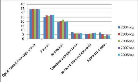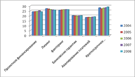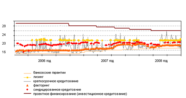 Рис. 2.4. Динамика структуры кредитного портфеля экспортно-ориентированных отраслей по видам кредитования, %* *Рассчитано автором по данным [18] Особенность кредитования экспортно-ориентированных отраслей заключается в кредитовании крупномасштабных инвестиционных проектов, предусматривающих техническое перевооружение, закупку нового оборудования, открытие нового завода. Этим обусловлено лидерское положение проектного финансирования за весь анализируемый период (см. рис. 2.4). Оно имеет наибольший удельный вес среди других видов кредитов, предоставляемых экспортно-ориентированным отраслям. Его доля на протяжении всего периода с 2004 по 2008 гг. существенно не менялась, и оставалась на уровне 34-35%. Второе место по форме предоставленных кредитов занимает лизинг. Его доля на рынке кредитования экспортно-ориентированных отраслей составила в в среднем за анализируемый период 25 – 27%. С 2006 года наблюдается рост данного вида кредитования, который по отношению к предыдущему году составил 11,5%. 2007 год принес несущественный спад, который составил 7%, однако в 2008 году лизинг подтвердил свою популярность и его доля возросла на 14%. За время, прошедшее после кризиса 1998 г., лизинг подтвердил свою состоятельность как альтернативный способ финансирования приобретения основных средств, и занял неплохую нишу на рынке кредитования и экспортно-ориентированных отраслей (см. рис. 2.4). Кроме того, банки иногда предпочитают финансировать приобретение основных средств через лизинговую компанию, так как лизинговая сделка предполагает более прочное обеспечение, чем просто кредит. Зарубежные поставщики также могут быть заинтересованы в использовании лизинга как механизма сбыта своей продукции. В качестве основного фактора развития лизинга в России следует отметить продолжающийся экономический рост и макроэкономическую стабилизацию [18, с. 59]. Третье место по видам кредитования экспортно-ориентированных отраслей занимает факторинг (см. рис.2.4). Его доля за весь анализируемый период не претерпела существенных изменений, и в среднем составила 20-23%. К тому же за период 20040-2008 гг. популярность этого вида кредита лишь увеличивалась. Рост популярности факторинга объясняется весьма просто. В отличие от банковских кредитов этот инструмент — фактически безналоговый в традиционном понимании, он доступен широкому кругу компаний. Их ненасыщенный спрос на привлечение финансирования в течение нескольких лет позволяет ожидать бурного роста факторинга [24, с. 19]. Такие виды кредитов как банковские гарантии, авиалирование платежей, краткосрочное кредитование, конечно используются, но их доля в общей структуре предоставленных кредитов экспортно-ориентированным отраслям, весьма не высокая и в среднем составляет 4 – 5% (см. рис. 2.4). На выбор того или иного кредитного продукта влияет его стоимость, тем более если речь идет о крупных суммах, и реализации крупномасштабных проектов. Ставки, по различным видам кредитных продуктов зависят как от срока кредитования, так и от объемов, а так же от ряда других факторов. Средневзвешенные ставки за 3 последних года анализируемого периода по различным видам кредитов представлены на рисунке 2.5.