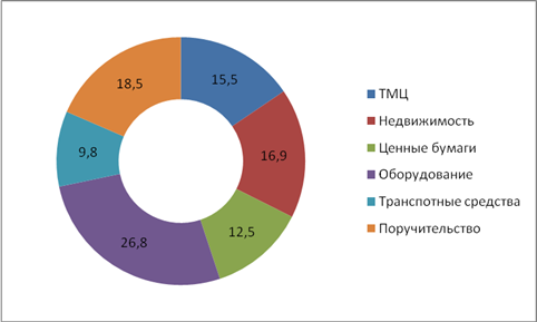 Рис.2.15. Ставки по различным видам кредитования отраслей, ориентированных на внутреннее потребление Иркутской области, %* *Источник: [42] Как видно из рисунка 2.15, структуре видов кредитования самым дорогим на протяжении всего анализируемого периода является краткосрочное кредитование, причем его стоимость, начиная с 2006 года росла, в среднем на 5 - 7%. Лизинг, факторинг, и проектное финансирование находятся примерно водной ценовой категории, и существенно ее не изменяют на протяжении всего исследуемого периода. Лишь стоимость лизинга корректируется в среднем на 2 - 3,5% ежегодно в сторону снижения. Банковские гарантии и авиалирование платежей – не являются дорогостоящими кредитными продуктами, и их стоимость на протяжении всего отчетного периода находится на уровне 18-20%, и так же существенно не меняется. При принятии кредитного решения как со стороны банка, так и со стороны предприятия учитывается не только ставка, объемы и сроки, но и то что является залогом, или обеспечением данного кредита или займа. Наиболее распространенные формы и виды обеспечения кредитов предприятий, ориентированных на внутреннее потребление Иркутской области представлены на рисунке 2.16.