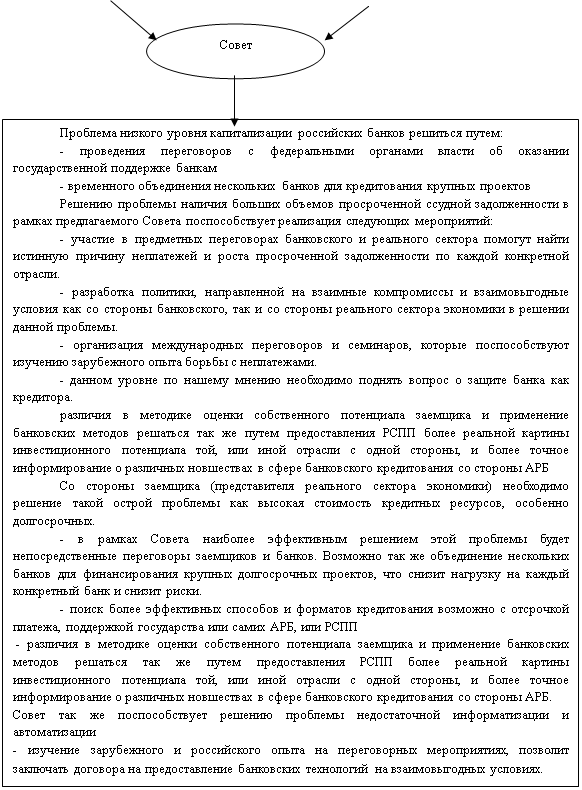 Рис.3.1. Предлагаемая схема взаимодействия банковского и реального сектора российской экономики* *Составлено автором Предлагаемый Совет сможет поспособствовать решению ключевых проблем взаимодействия банковского и реального сектора. РСПП объединяет 90% представителей реального сектора экономики. Каждый регион РФ имеет представительство в той или иной степени в данном Союзе. Эти два важнейших института занимаются развитием своих специализированных сфер. Наше предложение заключается в объединении этих усилий для преодоления проблем взаимоотношения банковского и реального сектора экономики. Таблица 3.1 Основные задачи АРБ И РСПП*