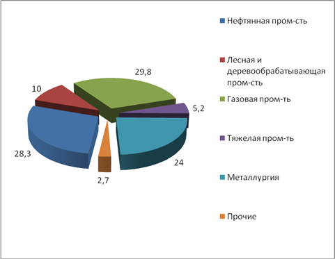 Рис.2.1. Динамика кредитования реального сектора экономики по видам отраслей* *Рассчитано автором по данным [18] Что касается экспортно ориентированных отраслей, то тенденция развития кредитования полностью повторяет развитие кредитования внутренне ориентированных отраслей. Рост объемов кредитования в целом за период составил 14 – 17% в среднем. Позитивное воздействие на объемы кредитов , предоставленные оказали благоприятная ситуация на внешнеэкономических рынках, улучшение социально-политической ситуации в стране после президентских выборов, заметное упорядочение государственных финансов в результате обеспечения первичного профицита государственного бюджета, повышение финансовой дисциплины, вытеснение неплатежей и увеличение доли денежных расчетов, снижение налоговой нагрузки. Эти факторы определяли положительную тенденцию предоставления кредитов именно в рублях [18, с. 22]. В структуре экспортно-ориентированных отраслей наибольший удельный вес объемов кредитования в среднем за анализируемый период занимают нефтяная промышленность – 28,8%; металлургия – 28,3%; и газовая промышленность – 24% ( рис 2.2).