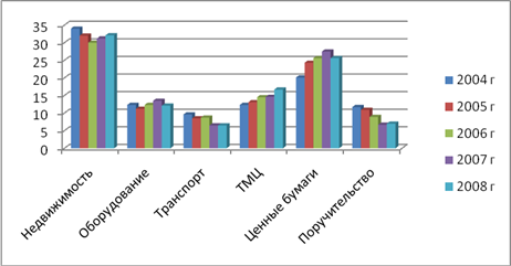 *Источник: [29] Как видно из таблицы 2.1, максимальное количество – 10 баллов, не набрала не одна отрасль. Наилучшие кредитные рейтинги — у нефтяной промышленности и металлургии, высокие экспортные доходы которых формируют стабильно высокие показатели их рентабельности, платежеспособности и кредитной дисциплины [24, с.99]. Причем нефтяная промышленность на протяжении всего анализируемого периода остается самой безрисковой среди прочих экспортно-ориентированных отраслей. В 2004 году кредитный рейтинг нефтяной отрасли оставался на уровне 9,5 из возможных 10 баллов. 2005 год принес некий спад, на 17,8%, который продолжился и в 2006 на 3,8%. Однако в 2007 году нефтяная промышленность вернула себе 3,8% потерянные в прошедшем году. А в 2008 году вернула себе абсолютное положение лидера в данном рейтинге и увеличила оценочный коэффициент до 9,6, т.е на 13,07% по сравнению с 2007 годом (см. табл. 2.1). Снижение кредитного рейтинга нефтяной промышленности в 2005 – 2006 гг. вначале объяснялось ухудшением мировой конъюнктуры цен на нефть (начало 2005 г.), а в дальнейшем явилось прямым следствием не вполне понятной для кредиторов организации финансирования ее производственной деятельности в 2005 г. — начале 2006 г.[44, с. 19]. Поступательное улучшение кредитного рейтинга металлургии с 6.5 в 2004–2005 гг. до 9.8 в 2008 г. (по 10-балльной шкале) было вполне ожидаемым в связи со стартовавшим летом 2005 г. ростом мировых цен на ее продукцию. Поэтому средний рост оценочного коэффициента данной отрасли составил в 2005 году – 0,48%; в 2006 году – 4,4%; в 2007 – 5,6%; в 2008 году – 25,3% (см. табл. 2.1). Эти отрасли в рейтинге идут с огромным отрывом от прочих, и объемы кредитов, получаемых ими в банках, ограничены главным образом нормативами, обязательными для кредитных организаций. Высокая концентрация производства этих отраслей и их растущая потребность в крупных дешевых долгосрочных кредитах существенно сужают поле деятельности для российских банков. С учетом стандартных требований к банкам по управлению рисками отечественной банковской системе будет сложно конкурировать с иностранными банками в финансировании той же нефтяной промышленности, инвестиционные потребности которой в 2008 г. оцениваются в 14–17 млрд. долл. США [44, с. 20]. Что касается газовой промышленности, то тренд коэффициентов рейтинга по рискам кредитования имеет стабильную положительную тенденцию. Их значение с каждым годом увеличивалось в среднем на 10-12%.(см. табл. 2.1). Рискованность кредитных вложений в эти отрасли действительно объективно выше, чем в металлургию и нефтяную промышленность, однако расчетный 2–3-кратный разрыв между кредитным рейтингом лидеров и прочих отраслей-экспортеров в значительной степени определяется недостаточной прозрачностью организации товарно-денежных потоков в этих отраслях. Данная отрасль имеет возможность демонстрировать существенно лучшие официальные финансовые показатели и более строгую кредитную дисциплину [54, с. 28]. С учетом фактора рискованности вложений в ту или иную отрасль, банки принимают во внимание и то, чем обеспечиваются выдаваемые кредиты и ссуды. Динамика структуры наиболее популярных видов обеспечения экспортно-ориентированных отраслей представлена на рисунке 2.6.
