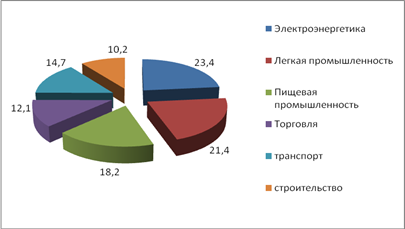 Рис. 2.7. Структура кредитного портфеля отраслей, ориентированных на внутренний рынок в среднем за анализируемый период, %* *Источник: [13] Как показывает рис. 2.7, наибольший удельный вес в среднем за анализируемый период в структуре кредитного портфеля отраслей, ориентированных на внутренний рынок занимает электроэнергетика, легкая и пищевая промышленность. Эти отрасли, наиболее кредитуемые в нашей стране. Это объясняется большой степенью износа основных средств и оборудования, при одновременном подъеме в объемах получаемой прибыли и перевооружении, и в целом положительных тенденциях развития данных отраслей. В отличие от мировой практики российская банковская система в основном кредитует отрасли, ориентированные на внутренний рынок под модернизацию производства (долгосрочные кредиты на обновление основных фондов), и на пополнение оборотных средств [13, с. 25]. Объемы, предоставленные этим отраслям экономики представлены в таблице 2.3. Как показывают данные, приведенные в таблице 2.3, наиболее кредитуемой отраслью является электроэнергетика. Причем с каждым годом объем предоставленных кредитов в эту отрасль увеличивается. Так в 2005 году рост составил 5%; в 2006 году – 2,1%; который увеличился в 2007 – 6,05%; , а в 2008 году – рост составил 5%. Таблица. 2.3 Объемы кредитования отраслей, ориентированных на внутренний рынок*