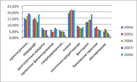 Рис. 2.10. Доля кредитного портфеля отраслей российской экономики, ориентированных на внутреннее потребление в различных российских банках, %* *Источник: ЦБРФ Как показано на рис. 2.7, наибольшая доля в структуре кредитного портфеля отраслей, ориентированных на внутреннее потребление, принадлежит Сбербанку. Его доля на протяжении всего анализируемого периода находилась на уровне 30%. Однако в 2006 году, она увеличилась на 2,3%, и в 2007 году вновь приняла исходное значение. Стабильное значение так же имеет доля ВТБ. На протяжении всего анализируемого периода ее значение составляло 25 – 25,5%. Третье место в структуре основных кредиторов отраслей, ориентированных на внутренний рынок принадлежит УралСибу. Тенденцию развития доли данного банка можно так же охарактеризовать как стабильную, без существенных изменений, находящейся на уровне 18,2-19%. МДМ Банк в 2004 году имел долю в 17,2%, которая в 2005 году осталась на прежнем уровне, а в 2006 году резко снизилась – на 20,1%. В 2007 году МДМ Банк частично вернул свои позиции на данном сегменте рынка, и рост объемов кредитования отраслей, ориентированных на внутреннее потребление составил 18,9%, и оставался на таком уровне на протяжении всего 2008 года. Тенденция деятельности ТрансКредитБанка повторяет ситуацию МДМ Банка. Доля на данном сегменте рынка данного банка оставалась стабильной до 2006 года, в котором произошел резкий спад – на 22,8%. Однако банк предпринял максим усилий для того, чтобы удержать свои позиции на данном сегменте рынка корпоративного кредитования. Ему это удалось – удержать об этом свидетельствует рост, который можно наблюдать в 2007 на 24%, который удержался на таком же уровне и в 2008 году. Анализ показывает, что, несмотря на довольно существенный рост финансовых результатов деятельности организаций, в экономике наблюдалось замедление инвестиционного процесса отраслей, ориентированных на внутренний рынок. Это дает основание полагать о слабой заинтересованности предприятий к активизации своей инвестиционной деятельности [44, с. 22]. В свою очередь, банковский сектор за последнее время расширил спектр предоставляемых услуг для наибольшего стимулирования спроса на предоставляемые кредитные продукты. Перечень видов кредитования, которыми в основном кредитуются отрасли, ориентированные на внутреннее потребление представлены на рисунке 2.9.