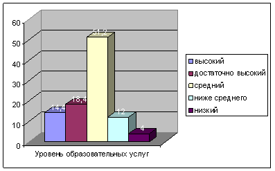 Рисунок 10 - Как Вы считаете, что мешает развиваться малому бизнесу в г. Нижнекамске? Ответ "ничего не мешает" дали 0% респондентов, это говорит о том, что даже не сведущие люди уверены - проблемы в этой области деятельности есть. Отсутствие первоначального капитала является уязвимым местом для многих молодых людей, стремящихся открыть свое дело, так как банки весьма неохотно дают займы без материальных гарантий, которых чаще всего у молодых предпринимателей нет. Эта проблема стоит довольно остро и тормозит деятельных людей в их попытках добиться успеха в коммерческой сфере. Бюрократия и запутанный процесс регистрации документов на открытие своего дела, высокие налоговые ставки, недобросовестные конкуренты и рэкет со стороны криминальных группировок - все эти немаловажные факторы того, что даже настойчивые и амбициозные молодые люди могут отказаться от реализации своих планов. Помочь в упорядочении планов и облегчении процесса регистрации должен помочь Закон "О развитии малого и среднего предпринимательства в РФ", принятый Государственной Думой 10 июля 2007 года. Одним из наиболее важных моментов имущественной поддержки малых и средних предприятий должно стать формирование перечней государственного и муниципального имущества, целевым образом предназначенного для предоставления во владение или пользование субъектам малых и средних предприятий, а также специальные налоговые режимы, возможность упрощенного бухгалтерского учета, ограничения по проверкам. Огромное значение для субъектов малых и средних предприятий имеет положение о нераспространении на них в течение первых четырех лет после регистрации законодательных изменений, ведущих к увеличению совокупной налоговой нагрузки. Реализация этой нормы потребует внесения изменений в 184-й и 131-й федеральные законы, определяющие полномочия органов государственной власти субъектов РФ и органов муниципального самоуправления. На вопрос "Как Вы оцениваете уровень образовательных услуг в Нижнекамском районе?" был получены следующие ответы: "высокий уровень" - 14,4%, "достаточно высокий" - 18,4%, "средний" - 51,2%, "ниже среднего" - 12%, "низкий" - 4% (представлено на рисунке 11).