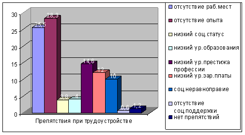 Рисунок 12 - Как Вы считаете, какие препятствия для молодежи существуют при трудоустройстве в г. Нижнекамске? Наибольшим препятствием при приеме на работу респонденты считают то, что работодатели неохотно нанимают молодых людей без практического опыта работы в данной области, которому чаще всего неоткуда взяться - многие студенты заканчивают учебные заведения, не проработав по специальности ни одного дня. Для решения этой проблемы было разработано много программ за рубежом, например, во Франции - программа "Новые услуги, новые рабочие места", целью которой было предоставление постоянных рабочих мест молодым людям без трудового опыта. Закон "О равенстве шансов" обязывал компании всех форм собственности ежегодно принимать на работу пропорционально численности штатов сотрудников моложе 25 лет, даже если последние не имели опыта работы по специальности. В России реализовались несколько программ, связанных с трудоустройством молодежи, например, программа "Молодежная практика", основной целью которой являлось расширение возможностей трудоустройства и приобретения профессиональных знаний, навыков и умений выпускников образовательных учреждений. Эта Программа реализовалась Министерством труда и социального развития с 1994 года и за годы своего существования она успела показать свою эффективность. Однако финансирование этой зарекомендовавшей себя Программы уже несколько лет как прекращено. Следующей проблемой респонденты называли отсутствие рабочих мест. По данным Центра занятости города Нижнекамска, за 2008 год число обращений граждан по вопросам трудоустройства и за консультацией составило 88392 единиц, количество граждан, ищущих работу, составило 26580 человек. В составе ищущих работу молодежь в возрасте 14-29 лет составляет 69%. В целях повышения эффективности, как трудоустройства безработных граждан, так и подбора подходящих работников для работодателей центром занятости населения проведено 27 ярмарок вакансий, которые посетили 1880 человек. При содействии центра занятости за 2008 населения трудоустроено лишь 4937 человек (из них 2679 учащихся, желающих работать в свободное от учебы время). Сотрудничество правительственных и неправительственных организаций в сфере трудоустройства молодежи очень важно. НПО, в первую очередь - молодежные (партийные, гражданские и объединения по интересам) могут получить статус "общественного исполнителя", если их работа соответствует задачам молодежной политики, и участвовать в реализации конкретных мероприятий. Но, даже при наличии рабочих мест, существует такое понятие как низкий уровень престижа профессии (к таким профессиям обычно относят учителей общеобразовательных школ, младших воспитателей, дворников, сборщиков мусора и других). Молодежь предпочитает не занимать подобные рабочие места также и из-за низкой заработной платы. Причиной также является низкий уровень образования в некоторых учебных заведениях - студенты, получив такие дипломы, не могут устроиться на работу по специальности. Реализации Программы об образовании может помочь решить эту проблему. На данный момент происходит ликвидация тех учебных заведений, которые не прошли аккредитацию или не подходят под ГОСТ. Социальное неравноправие при устройстве на работу подразумевает, что мигрантов, беженцев, многодетных или б
