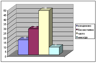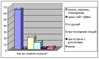 Рисунок 2 - Как часто Вы интересуетесь событиями, происходящими в Вашем городе? Далее следовал закономерный вопрос "Как Вы чаще всего узнаете о новых событиях, происходящих в Вашем городе?". Вариант "газеты, журналы, телевидение" выбрали 64% респондентов, "через сайт УДМиС (www.udmnk.ru)" - 0%, "от друзей, посещающих спортивные секции" - 19,2%, "при самостоятельном посещении кружков, сессий, мероприятий" - 11,2%, "при встрече с депутатами и представителями власти МО" - 2,4%, вариант "никак не узнаю" набрал 3,2% голосов (представлено на рисунке 3).