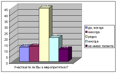 Рисунок 3 - Как Вы чаще всего узнаете о новых событиях, происходящих в Вашем городе? Самым распространенным вариантом получения новых данных о мероприятиях и событиях, происходящих в городе и районе, оказалась реклама. Газеты, молодежные журналы, программы на телевидении и радио, брошюры, перетяжки, объявления, афиши - это все создано для пропаганды, отсюда молодые люди черпают большую часть получаемой из внешнего мира информации. Правильные манипуляции с рекламой молодежных событий и происходящих мероприятиях могут принести наибольший эффект при реализации молодежных целевых программ на муниципальном уровне. Следующий вариант - посещение официального сайта УДМиС не выбрал никто, потому что адрес сайта знают лишь те, кто в нем заинтересован, а молодые люди чаще всего не догадываются о его существовании. Варианты третий и четвертый показывают, что собственное участие в каких-либо событиях, мероприятиях или посещение секций не всегда означает, что участники в курсе всех молодежных кампаний. Здесь также нужна реклама и работа для PR. Встреча с депутатами и другими представителями органов власти чаще всего присуща старшей молодежи, в то время как школьники и студенты чаще всего не посещают такие встречи, соответственно не черпают информацию из данного источника. Далее был задан вопрос об участии молодежи в событиях своего города и района. Вопрос "Как часто Вы участвуете в событиях своего города?" ранжирован по частоте. Вариант "да, всегда" выбрали 12% респондентов, "иногда" - 20%, "редко" - 44,8%, "никогда, потому что неинтересно" - 12,8%, "никогда, потому что не имею талантов" - 10,4% (представлено на рисунке 4).