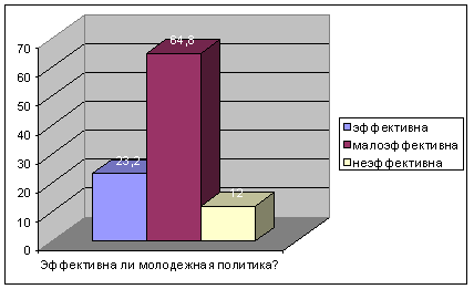 Рисунок 4 - Как часто Вы участвуете в событиях своего города? Вариант "да, всегда" выбрали те респонденты, которые посещают какие-либо секции или кружки по интересам, они чаще всего и являются самыми осведомленными о молодежной жизни города. Вариант "редко участвую, в основном зритель" набрал наибольшее количество ответов, потому что даже если молодые люди узнают о каких-либо соревнованиях или мероприятиях, они все равно редко участвуют в процессе. В последние несколько лет победители соревнований получают хорошие призы, что способствует развитию многих видов спорта. Ответ "иногда" показывает, что молодые люди чаще всего не находят времени для занятий спортом или творческой деятельностью из-за высокой загруженности в учебе или работе. Два варианта ответа "никогда, потому что неинтересно" и "никогда, потому что не имею талантов" набрали примерно одинаковое количество голосов. Но в сумме они становятся уже угрожающей статистикой неприспособленности молодежи в социализации и адаптации. Вопрос на свободное построение ответа: "Скажите, что для Вас значит понятие "молодёжная политика"?" Ответили "не знаю" или оставили поле пустым 44% респондентов. Более или менее точное определение дали 27% респондентов, в основном - студенты и старшие школьники, остальные 29% ответили довольно расплывчато. Из этого следует, что сами молодые люди смутно представляют себе, что такое "молодежная политика" и с какой целью она реализуется. Следует проводить ликбез о правах и обязанностях молодежи, о Программах, реализуемых для повышения благосостояния молодых людей. Вопрос "Как Вы считаете, эффективна ли молодежная политика, реализуемая в г. Нижнекамске?" получил следующие ответы: считают, что эффективна 23,2%, малоэффективна 64,8%, неэффективна 12% (представлено на рисунке 5).