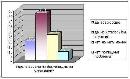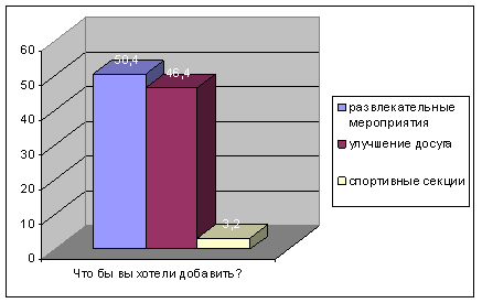 Рисунок 8 - Удовлетворены ли Вы своими жилищными условиями? На сегодняшний день в Нижнекамском отделении Общественной организации "Объединение молодежного строительства Республики Татарстан" зарегистрированы 2713 молодых семей, нуждающихся в улучшении жилищных условий (в 2004 году принято 900 заявлений, в 2005 году - 370, в 2006 году - 183, в 2007 году - 93 заявления, в 2008 году - 112). Вопрос "Что бы Вы хотели изменить в культурной жизни своего города и района?". Ответы "добавить больше развлекательных мероприятий для молодежи" - 50,4%, "улучшить качество досуговых мероприятий для молодежи" - 46,4%, "добавить спортивных секций" - 3,2% (представлено на рисунке 9).