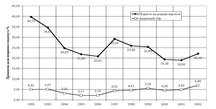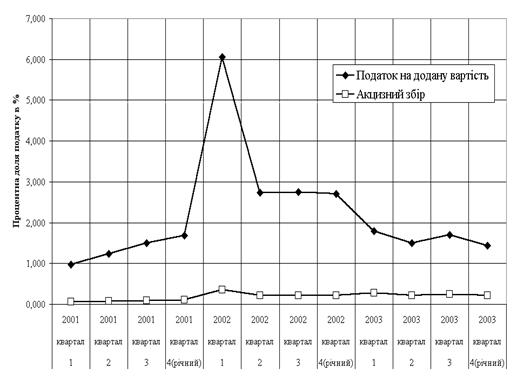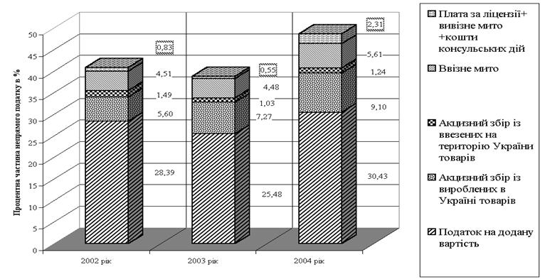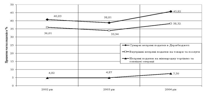 Рис.2.4 Динаміка фактичної долі сплати непрямих податків СП "КИПАРИС" до бюджету від валового доходу при продажу товарів кінцевим споживачам у 2001 – 2003 роках Як показують графіки на рис.2.2 2.4 СП "КИПАРИС" : у 2003 році вдалося зменшити фактичну сплату податка ПДВ до бюджету (різницю між податковим зобов'язанням та податковим кредитом) у 1,7 рази у порівнянні з 2002 роком, тобто в середньому – 1,5% від валового доходу; сплата акцизного збору стабілізувалась на рівні 0,22 –0,26 % від валового доходу Таким чином, загальні втрати СП "КИПАРИС" на сплату непрямих податків на споживання з ціни товара до бюджету становлять приблизно 1,7 % від валового доходу, що практично мінімізує вплив непрямих податків на фінансово-господарську діяльність торгового посередника – СП "КИПАРИС". РОЗДІЛ 3. ПРОБЛЕМИ ТА ШЛЯХИ ВДОСКОНАЛЕННЯ МЕХАНІЗМУ НАРАХУВАННЯ ТА СТЯГНЕННЯ НЕПРЯМИХ ПОДАТКІВ НА СПОЖИВАННЯ В УКРАЇНІ 3.1 Роль непрямих податків у формуванні доходів Державного бюджету України Основні засади бюджетної системи України, її структура, принципи, правові засади функціонування, основи бюджетного процесу і міжбюджетних відносин та відповідальність за порушення бюджетного законодавства регулюються Бюджетним Кодексом України. Бюджетна система України складається з державного бюджету та місцевих бюджетів. Бюджетами місцевого самоврядування визнаються бюджети територіальних громад сіл, селищ, міст та їх об'єднань. Місцевими бюджетами визнаються бюджет Автономної Республіки Крим, обласні, районні бюджети, бюджети районів у містах та бюджети місцевого самоврядування. Зведений бюджет є сукупністю показників бюджетів, що використовуються для аналізу і прогнозування економічного і соціального розвитку держави. Зведений бюджет України включає показники Державного бюджету України, зведеного бюджету Автономної Республіки Крим та зведених бюджетів областей та міст Києва і Севастополя. Доходна частина Державного бюджету України щорічно формується згідно нормативів Бюджетного Кодексу України по закріпленню загальнодержавних податків і зборів та щорічного перерозподілу деяких податків і зборів між Державним та місцевими бюджетами у вигляді процентних норм. Непрямі податки повністю надходять до Державного бюджету України та перерозподіляються між його загальним та спеціальними фондами, як наприклад у 2004 році .Стаття 2. Установити, що до доходів загального фонду Державного бюджету України на 2004 рік належать: 7) суми податку на додану вартість, які підлягають зарахуванню до доходів Державного бюджету України; 8) акцизний збір з вироблених в Україні товарів (крім акцизного збору з вироблених в Україні товарів, що сплачується платниками, які зареєстровані в Автономній Республіці Крим, 80 відсотків акцизного збору з вироблених в Україні нафтопродуктів і транспортних засобів); 9) акцизний збір з ввезених на територію України товарів (крім 80 відсотків акцизного збору з ввезених на територію України нафтопродуктів і транспортних засобів); 12) ввізне мито (крім 80 відсотків ввізного мита з нафтопродуктів і транспортних засобів та шин до них); Стаття 5. Установити, що суб'єкти підприємницької діяльності, які здійснюють експорт природного газу, сплачують ставку вивізного (експортного) мита у розмірі 10 доларів США за 1.000 куб. метрів та експорт скрапленого газу, сплачують 