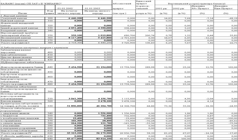 Таблиця 2.5 Баланси ЗАТ СП з ІІ "КИПАРИС '' за 2001 2002 роки
