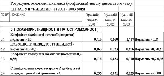 У табл.Д.1 Додатку Д представлені результати вертикального(структура статей балансу в % до загальної валюти балансу) і горизонтального(динаміка хронологічної зміни статті балансу, віднесена до значення в попередньому періоді) аналізу балансів СП ЗАТ з ІІ "КИПАРИС" , що дозволяють аналізувати як динаміку зміни сум статей балансу підприємства протягом року по кварталах, так і досліджувати зміну внутрішньої структури статей балансу [37]. Основні результати проведеного ретроспективного аналізу динаміки активів і пасивів балансу підприємства у вертикальному і горизонтально-хронологічному розрізах за 2001 –2002 роки, дозволяють констатувати наступне : 1. За звітний період (2002 рік) у структурі пасивів балансу (джерел) виникли наступні зміни(відносно рівня 2001 року): - при загальному зростанні валюти балансу на +93,01 % (з 43,477 млн.грн. до 83,914 млн.грн.), власний капітал, який знаходиться в стадії формування підвищеного статутного фонду, зріс на 136,8 %(з 2,719 млн.грн до 6,440 млн.грн) ; - у звітному періоді доля власного капіталу підприємства в валюті балансу зросла з 6,25 % до 7,67 % ; - довгострокові кредитні ресурси та спеціалізовані фонди майбутніх виплат в балансі займають значну зростаючу долю з 12,5%(2001) до 25,26 %(2002) та в 23 рази більше власного капіталу; - кредиторська заборгованість значно зросла на +44,86 % (з 31,896 млн.грн до 46,204 млн.грн.), а її доля в валюті пасивів зменшилася з 73,36 % в базовому періоді (на початок 2002 року) до 55,06 % у звітному періоді; - поточна заборгованість за довгостроковими зобов'язаннями (обслуговування довгострокових ресурсів) зросла з 3,041 млн.грн. до 4,175 млн.грн., займаючи структурну долю з 7,0%(2001) до 4,157%(2002); - підприємство стало оформлювати частину кредиторської заборгованості виданими векселями на суму 3,478 млн.грн., що становить структурну долю 4,14% в валюті пасивів; - загальна доля поточних запозичених ресурсів зменшилася з 81,25% у базовому році(2001) до 67,07 % у звітному році (2002); 2. У структурі активів за звітний період (2002 рік) виникли наступні істотні зміни : - при загальному зростанні валюти балансу на +93,01 % (з 43,477 млн.грн. до 83,914 млн.грн.), необоротні активи зросли на + 3,45% ( з 28,882 млн.грн. до 29,878 млн.грн.) , а оборотні активи зросли на +270,28 % (з 14,593 млн.грн. до 54,035 млн.грн.) ; - доля необоротних активів в валюті балансу активів у звітному періоді знизилась з 66,43 % (базовий період) до 35,62 % , загальна доля оборотних активів в валюті балансу, відповідно, зросла з 33,57% (базовий період) до 64,39% ; - доля запасів в валюті балансу активів підвищилась з 21,72%(базовий період) до 56,29% (звітний період); - доля дебіторської заборгованості за відпущену продукцію зменшилась в валюті балансу активів з 3,89%(базовий період) до 4,19% при зростанні суми дебіторської заборгованості на + 108,0 % (з 1,689 млн.грн. до 3,513 млн.грн.); - сума грошових коштів в касі у звітному періоді підвищилася до 1,102 млн.грн. при її значенні в базовому періодах 0,533 млн.грн. , що становить 1,23 –1,31 % частину в валюті балансу ; Основні результати проведеного ретроспективного аналізу динаміки активів і пасивів балансу підприємства у вертикальному і горизонтально хронологічному розрізах за 2002 –2003 роки(табл.Д.9 Додатку Д ), дозволяють констатувати наступну динаміку : 1. За звітний період (2003 рік) у структурі пасивів балансу (джерел) виникли наступні зміни(відносно рівня 2002 року): - при загальному зростанні валюти балансу на +13,01 % (з 83,914 млн.грн. до