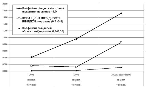 Результати розрахунків коефіціентів – показників фінансового стану згідно алгоритмів табл.2.8 –2.11 наведені в табл. Д.4 –Д.8 Додатку Д. Як видно з результатів розрахунків показників ліквідності, платоспроможності та джерел покриття виробничих запасів СП ЗАТ з ІІ "КИПАРИС" (табл.Д.6 – Д.8 Додатку Д) : - на базову(2001) та дві звітні дати (2002,2003) показники покриття запасів переміщуються з зони кризового фінансового стану до границі нестійкого фінансового стану, тобто запаси підприємства покриваються за рахунок суми вільного власного та залученого капіталів; - показники платоспроможності та ліквідності характеризуються позитивним переміщенням у 2003 році з зони невиконання нормативів (2001-2002 роки) до зони стійкого виконання нормативів(рис. 2.1): - Як видно з результатів розрахунків показників рентабельності та фінансової стійкості в СП ЗАТ з ІІ "КИПАРИС" (табл.Д.5 Додатку Д) : - рентабельність активів та власного капіталу по чистому доходу та прибутку відносно базового року зменшилася у звітних роках в кілька разів, при цьому підприємство малоприбуткове та працює на грані беззбитковості ;