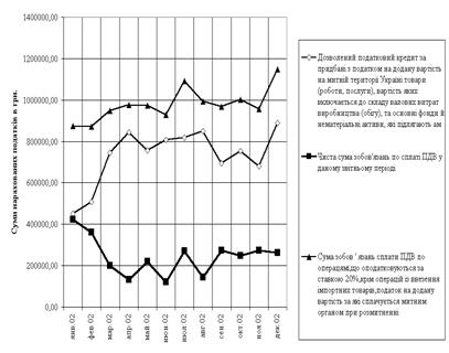 Рис. 2.2 Мінімізація сплаченої суми податку на додану вартість СП "КИПАРИС" за рахунок зближення податкових зобов'язань та податкового кредиту у 2002 році (за даними щомісячних декларацій по ПДВ)