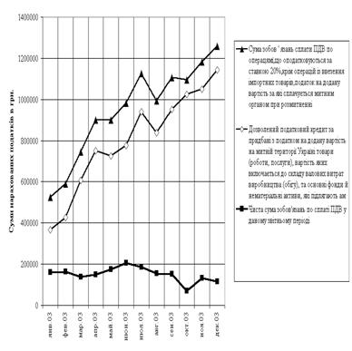 Рис. 2.3 Мінімізація сплаченої суми податку на додану вартість СП "КИПАРИС" за рахунок зближення податкових зобов'язань та податкового кредиту у 2003 році (за даними щомісячних декларацій по ПДВ)