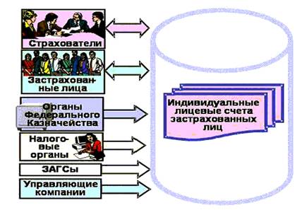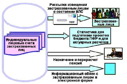 Рисунок 1.1 – Использование информационной базы персонифицированного учета - осуществления индивидуального (персонифицированного) учета в процессе всей трудовой деятельности застрахованного лица и использования данных указанного учета для назначения трудовой пенсии согласно пенсионному законодательству Российской Федерации, в том числе для реализации застрахованными лицами пенсионных прав в соответствии с законодательством Российской Федерации о профессиональных пенсионных системах. Индивидуальный лицевой счет застрахованного лица На территории Российской Федерации на каждое застрахованное лицо Пенсионный фонд Российской Федерации открывает индивидуальный лицевой счет с постоянным страховым номером, содержащим контрольные разряды, которые позволяют выявлять ошибки, допущенные при использовании этого страхового номера в процессе учета. Индивидуальный лицевой счет застрахованного лица состоит из общей, специальной и профессиональной частей (разделов). В общей части индивидуального лицевого счета застрахованного лица указываются: 1) страховой номер; 2) фамилия, имя, отчество; 3) дата рождения; 4) место рождения; 5) пол; 6) адрес постоянного места жительства; 7) серия и номер паспорта или удостоверения личности, дата выдачи указанных документов, наименование выдавшего их органа; 8) гражданство; 9) дата регистрации в качестве застрахованного лица; 10) периоды трудовой и (или) иной деятельности, включаемые в страховой стаж для назначения трудовой пенсии, а также страховой стаж, связанный с особыми условиями труда, работой в районах Крайнего Севера и приравненных к ним местностях; 11) иные периоды, засчитываемые в страховой стаж в соответствии со статьей 11 Федерального закона от 17 декабря 2001 г. № 173-ФЗ "О трудовых пенсиях в Российской Федерации"; 12) заработная плата или доход, на которые начислены страховые взносы в соответствии с законодательством Российской Федерации; 13) сумма начисленных страхователем данному застрахованному лицу страховых взносов; 14) суммы уплаченных и поступивших за данное застрахованное лицо страховых взносов; 15) сведения о расчетном пенсионном капитале, включая сведения о его индексации; 16) сведения об установлении трудовой пенсии и индексации ее размера, включая страховую часть трудовой пенсии; 17) сведения о закрытии индивидуального лицевого счета застрахованного лица. В специальной части индивидуального лицевого счета застрахованного лица указываются: 1) суммы страховых взносов, поступивших на накопительную часть трудовой пенсии; 2) сведения о выборе застрахованным лицом инвестиционного портфеля (управляющей компании); 3) сведения, отражающие результаты ежегодной передачи средств пенсионных накоплений на инвестирование управляющим компаниям; 4) сведения, отражающие результаты временного размещения средств пенсионных накоплений в период до отражения их в специальной части индивидуального лицевого счета; 5) сведения, отражающие учет дохода от инвестирования средств пенсионных накоплений; 6) сведения, отражающие учет необходимых расходов на инвестирование средств пенсионных накоплений; 7) сведения о передаче средств пенсионных накоплений от одной управляющей компании другой; 8) сведения о передаче средств пенсионных накоплений в негосударственный пенсионный фонд; 9) сведения о переда