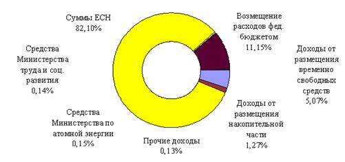 Рисунок 2.6 – Структура расходов бюджета ПФР в 2003 году «Выплата пенсий по государственному пенсионному обеспечению» в расходной части бюджета ПФР выделена отдельной строкой, на нее приходится не значительная часть финансовых ресурсов 49348,4 млн. руб., или 5,71 % общих расходов. В расходной части бюджета Пенсионного фонда прописаны суммы тех статей, за которыми закреплены свои источники доходов, речь о которых шла ранее. К статьям, имеющим отражение, как в доходной, так и в расходной части бюджета, также относятся и «расходы по накопительной составляющей бюджета Пенсионного фонда России» (включая расходы фонда связанные с ведением специальной части индивидуального лицевого счета). На их долю приходится 6,53 %. Следующей расходной статьей бюджета ПФР, на которую следует обратить внимание, является – «финансирование и материально-техническое обеспечение текущей деятельности фонда и его территориальных органов, а также другие мероприятия связанные с деятельностью фонда». Расходы на эти цели составляют 22832,42 млн. руб. или 2,64 % всех расходов Пенсионного фонда, в том числе на функционирование органов государственных внебюджетных фондов 2,51 %. В связи с дефицитностью бюджета Пенсионного фонда определены источники внутреннего финансирования дефицита бюджета ПФР в 2003 году (см. приложение М). Установлен размер резерва бюджета по состоянию на 1 января 2003 года в объеме, равном остатку средств бюджета фонда по состоянию на 1 января 2003 года, за исключением средств пенсионных накоплений, включающих в себя страховые взносы на накопительную часть трудовой пенсии, поступившие в 2002 году, а также чистый финансовый результат от временного размещения указанных страховых взносов. Средства резерва бюджета сверх сумм, направляемых на обеспечение текущей сбалансированности бюджета Фонда и пополнение норматива оборотных денежных средств бюджета Фонда (50 % объема расходов на выплату пенсий в предстоящем месяце), считаются временно свободными средствами бюджета и размещаются в разрешенные законодательством РФ виды активов в порядке, установленном Правительством РФ. Средства, полученные от размещения временно свободных средств, направляются на пополнение резерва бюджета. 2.3Анализ доходной и расходной части бюджета Пенсионного фонда России за 2004 год Федеральным законом от 23 декабря 2003 года № 175-ФЗ «О бюджете Пенсионного фонда РФ на 2004 год» утвержден бюджет ПФР, по доходам в сумме 1000316,63 млн. руб., из них 916649,75 млн. руб. в части, не связанной с обязательным накопительным финансирование трудовых пенсий, и по расходам в сумме 946640,16 млн. руб., из них 936398,4 млн. руб. в части, не связанной с обязательным накопительным финансированием трудовых пенсий. На покрытие дефицита фонда (не связанного с обязательным накопительным финансированием трудовых пенсий), направляются средства резерва бюджета Фонда предусмотренного в сумме 19748,7 млн. руб. Таким образом, по данным таблицы 2.6 «Структура доходов бюджета Пенсионного фонда РФ в 2004 году» (см. приложение Н) дефицит бюджета ПФР в 2003 году составил 2,15 %. Как и в прошлые годы, более половины всех поступлений в бюджет ПФР приходится на неналоговые доходы 533748,34 млн. руб. или 53,36 %. Среди этой группы доходов особое внимание заслуживают «безвозмездные перечисления (субвенции)», так как на их долю приходится основная часть неналоговых