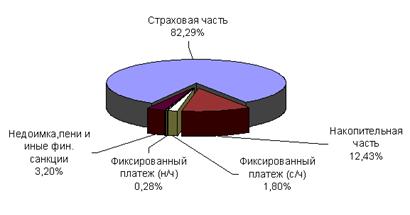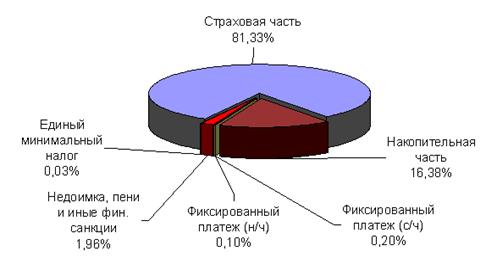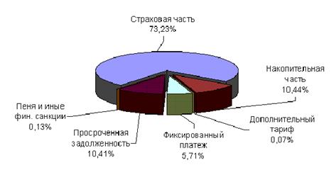 Рисунок 2.1 – Структура неналоговых доходов бюджета ПФР в 2002 году Если же посмотреть на другую группу доходов бюджета ПФР – налоговую, то мы увидим, что среди этой группы наибольший удельный вес занимает статья, на которую приходится 73,23 % всех налоговых поступлений в Пенсионный фонд – это «страховые взносы, зачисляемые в фонд на выплату страховой части трудовой пенсии». Далее в порядке убывания следуют «страховые взносы, зачисляемые в фонд на выплату накопительной части трудовой пенсии», и «мобилизация просроченной задолженности плательщиков ЕСН в фонд», на долю каждой группы этих доходов приходится более 10 % налоговых поступлений. Незначительными налоговыми доходами являются «страховые взносы в виде фиксированного платежа» 2,45 % доходов бюджета ПФР, наименее значительными – «страховые взносы по дополнительному тарифу» и «суммы пени и иных финансовых санкций», их общая сумма не превышает 0,01 % доходов Пенсионного фонда.