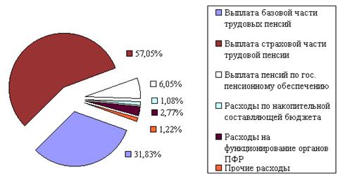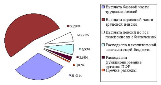 Рисунок 2.5 – Структура налоговых доходов бюджета ПФР в 2003 году Незначительными налоговыми доходами являются «доходы, полученные в результате поступления недоимки, пени и иных финансовых санкций по страховым взносам» 1,51 % всех доходов ПФР. Наименее значительными – «страховые взносы в виде фиксированного платежа зачисляемые в фонд на выплату страховой и накопительной части трудовой пенсии», в общем, они составляют около 1 % доходов Пенсионного фонда. По данным таблицы 2.4 «Структура расходов бюджета ПФР в 2003 году» (см. приложение Л) видно, что основной расходной статьей бюджета Пенсионного фонда является – расходы по обязательному пенсионному страхованию». На данный вид расходов приходится 729063,97 млн. руб., что составляет 84,29 % всех расходов ПФР. Расходы по обязательному пенсионному страхованию включают: § выплату базовой части трудовой пенсии - 31,01 %; § выплату страховой части трудовой пенсии, пособий и компенсаций - 53,24 %; § выплату пенсий гражданам, выехавшим на постоянное жительство за пределы РФ – 0,04 %.