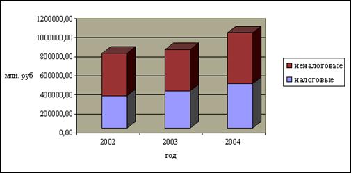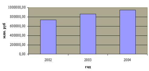 Рисунок 2.9 – Структура расходов бюджета ПФР в 2004 году «Выплата пенсий по государственному пенсионному обеспечению» в расходной части бюджета ПФР выделена отдельной строкой, на нее приходится не значительная часть финансовых ресурсов 57241,98 млн. руб., или 6,05 % общих расходов. В структуре расходной части бюджета Пенсионного фонда на «расходы по накопительной составляющей бюджета Пенсионного фонда России» (включая расходы фонда связанные с ведением специальной части индивидуального лицевого счета) приходится чуть более 1 %. Следующей расходной статьей бюджета ПФР, на которую следует обратить внимание, является – «финансирование и материально-техническое обеспечение текущей деятельности фонда и его территориальных органов, а также другие мероприятия связанные с деятельностью фонда». Расходы на эти цели составляют 26228,11 млн. руб. или 2,77 % всех расходов Пенсионного фонда, в том числе на функционирование органов государственных внебюджетных фондов 2,64 %. В связи с дефицитностью бюджета Пенсионного фонда определены источники внутреннего финансирования дефицита в части не связанной с обязательным накопительным финансированием в 2004 году (см. приложение Р). Установлен размер резерва бюджета по состоянию на 1 января 2004 года в объеме, равном остатку средств бюджета Фонда по состоянию на 1 января 2004 года, за исключением средств пенсионных накоплений по состоянию на 1 января 2004 года. Средства резерва бюджета сверх сумм, направляемых на обеспечение текущей сбалансированности бюджета Фонда и пополнение норматива оборотных денежных средств бюджета Фонда (50 % объема расходов на выплату пенсий в предстоящем месяце), считаются временно свободными средствами бюджета и размещаются в разрешенные законодательством РФ виды активов в порядке, установленном Правительством РФ. Средства, полученные от размещения временно свободных средств, направляются на пополнение резерва бюджета. 2.4 Оценка бюджета Пенсионного фонда России за период с 2002 по 2004 год По данным таблицы 2.9 «Изменение доходной части бюджета Пенсионного фонда РФ за 2002 - 2004 год» (см. приложение С) видно, что доходы ПФР за данный период возросли на 27,68 %, в том числе налоговые на 38,81%.