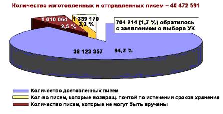 Рисунок 1.3 – Итоги информирования в 2003г. застрахованных лиц о состоянии специальной части индивидуальных лицевых счетов В связи с введением в действие в действие Федерального закона № 173-ФЗ по состоянию на 1 января 2002 года произведена конвертация пенсионных прав по общему стажу работающего и заработку за 2000 и 2001 годы. Пенсия для всех работающих и неработающих граждан, в том числе и пенсионеров, начисленная или пересчитанная по состоянию на 01.01.2002 года будет являться пенсионным капиталом застрахованного лица. Ежегодно, в зависимости от уплаченных страховых взносов и страхового стажа работающих лиц, пенсионный капитал будет увеличиваться. Конвертация носит разовый характер и будет осуществлена органами Пенсионного фонда в сжатые сроки: с 1 июля 2003 года по 31 декабря 2004 года. Сбор сведений от страхователей о включаемых в страховой стаж периодах работы, которые приобретены всеми работающими у него застрахованными лицами до их регистрации в системе индивидуального персонифицированного учета будет осуществляться с 1 июля по 31 декабря 2003 года. Физические лица, самостоятельно уплачивающие страховые взносы, а также не работающие граждане представляют указанные сведения на себя лично и предъявляют первичные документы, на основании которых заполнены сведения. На следующем этапе конвертации будет осуществляться обработка представленных сведений и правовая оценка пенсионных прав застрахованных лиц. В 2003 году Пенсионный фонд РФ преступил к созданию консультационных пунктов на базе крупных предприятий, а также администраций городов, сел, поселков. Консультационные пункты создаются для оказания квалифицированной консультативной помощи страхователю, застрахованным лицам по вопросам пенсионного законодательства, проведение информационной и разъяснительной работы среди населения в связи с введением системы пенсионного страхования, повышения активности населения в реализации пенсионной реформы в Российской Федерации. Сотрудник консультационного назначается руководителем организации из числа работников, и проходит курс обучения в Пенсионном фонде. Консультационные пункты обеспечиваются всеми нормативными документами по вопросам пенсионной реформы, памятками для страхователя и застрахованных лиц, необходимыми бланками, формализованными ответами на типичные вопросы застрахованных лиц. Сотрудник консультационного пункта выполняет следующую работу: ü принимает от застрахованных лиц заявления о выборе инвестиционного портфеля (управляющей компании), запросы о представлении выписки из лицевого счета; ü дает разъяснение застрахованным лицам: по информации содержащейся в выписки индивидуального лицевого счета, по управляющим компаниям, заключившим договора доверительного управления средствами пенсионных накоплений с Пенсионным фондом; ü обобщает и передает в Пенсионный фонд информацию по наиболее типичным вопросам, поступившим от застрахованных лиц. Во многих субъектах РФ действуют программы обязательного медицинского страхования пенсионеров, в том числе такая программы работает и на территории Хабаровского края. Суть этой программы заключается в том, что Пенсионный фонд принимает на себя наряду с Субъектом РФ, вступившим в эту программу, функции страхователя в отношении неработающих пенсионеров – пол