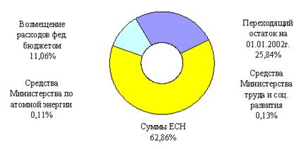 Следующей расходной статьей бюджета ПФР, на которую следует обратить внимание, является – «финансирование и материально-техническое обеспечение текущей деятельности фонда и его органов, а также другие мероприятия связанные с деятельностью фонда». Расходы на эти цели составляют 22844,88 млн. руб. или 3,09 % всех расходов Пенсионного фонда, в том числе на содержание органов фонда 2,69 %. Необходимо отметить, что финансирование расходов на улучшение условий проживания престарелых граждан и инвалидов в стационарных учреждениях социального обслуживания населения, оказание адресной социальной помощи нуждающимся пенсионерам и инвалидам, осуществляется за счет сумм пеней и иных финансовых санкций, а также за счет средств полученных в результате мобилизации просроченной задолженности плательщиков страховых взносов. В целом бюджет Пенсионного фонда является сбалансированным, его расходы подкреплены соответствующими доходными источниками, а профицит бюджета ПФР является неплохим заделом на будущий 2003 год. Следует отметить, что сумма фактического превышения доходов над расходами фонда, уменьшенная на сумму направляемую, на формирование норматива оборотных денежных средств на 1 января 2003 года (установленная в размере 40 % объема расходов на выплату пенсий в предстоящем месяце) направляется на создание резерва бюджета Фонда. 2.2Анализ доходной и расходной части бюджета Пенсионного фонда России за 2003 год Федеральным законом от 31 декабря 2002 года № 197-ФЗ «О бюджете Пенсионного фонда РФ на 2003 год», и федеральным законом от 08 декабря 2003 года № 168-ФЗ О внесении изменений в федеральный закон «О бюджете пенсионного фонда РФ на 2003 год» утвержден бюджет ПФР, по доходам в сумме 822841,4 млн. руб., и по расходам в сумме 864898,3 млн. руб. На покрытие дефицита фонда, направляется часть средств резерва бюджета фонда предусмотренного в сумме 42056,9 млн. руб. Таким образом, по данным таблицы 2.3 «Структура доходов бюджета Пенсионного фонда РФ в 2003 году» (см. приложение К) дефицит бюджета ПФР в 2003 году составил 5,11 %. Как и в прошлом году, более половины всех поступлений в бюджет ПФР приходится на неналоговые доходы 433681,4 млн. руб. или 52,71 %. Среди этой группы доходов особое внимание заслуживают «безвозмездные перечисления (субвенции)», так как на их долю приходится основная часть неналоговых поступлений 96,19 %, в том числе: § средства единого социального налога, поступающие из федерального бюджета 84,31 %. § средства федерального бюджета, передаваемые фонду в соответствии с законодательством РФ 11,60 %. Следует отметить, что в составе субвенций прописаны статьи доходов, имеющие отражение и в расходной части бюджета ПФР. К ним относятся «средства федерального бюджета, передаваемые фонду Министерством труда и социального развития РФ, на выплату пенсий и пособий». А также, «средства передаваемые фонду из целевого бюджета фонда Министерства РФ по атомной энергии, для обеспечения выплаты дополнительного ежемесячного пожизненного материального обеспечения работникам организаций ядерного оружейного комплекса РФ». На их долю приходится 0,28 %.
