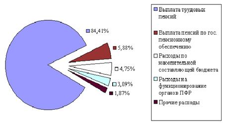 Рисунок 2.2 – Структура налоговых доходов бюджета ПФР в 2002 году По данным таблицы 2.2 «Структура расходов бюджета ПФР в 2002 году» (см. приложение И) видно, что основной расходной статьей бюджета Пенсионного фонда является - выплата трудовых пенсий. На ее долю приходится 623909,71 млн. руб., что составляет 84,41 % всех расходов ПФР. В расходной части бюджета Пенсионного фонда прописаны суммы тех статей, за которыми закреплены свои источники доходов, речь о которых шла ранее. К статьям, имеющим свое отражение, как в доходной, так и в расходной части бюджета, также относятся «расходы на выплату доплаты к пенсии, включая расходы на доставку и пересылку, финансируемые за счет страховых взносов фактически поступающих по дополнительному тарифу», и «перечисление средств страховых взносов на накопительную часть трудовой пенсии, включая расходы фонда связанные с ведением специальной части индивидуального лицевого счета». На долю последних расходов приходится 4,75 %. Рисунок 2.3 – Структура расходов бюджета ПФР в 2002 году