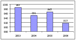Рисунок 2.2.3 – Динамика издания распоряжений Главы Совета г. Нижнекамска и Нижнекамского района Исходя из того, что в целом количество принятых аппаратом администрации распорядительных документов увеличилось, и количество принятых Главой администрации документов в целом снизилось, следует, что активную роль в принятии управленческих решений в 2006 году играли заместители Главы администрации г. Нижнекамска и Нижнекамского района, что отразим на рисунке 2.2.4.