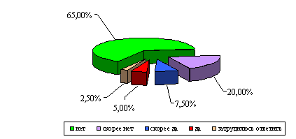 Рисунок 15. Распределение ответов на вопрос «Удовлетворены ли Вы социальной политикой государства в отношении поддержки семей с детьми?» Анализ данных рисунков 14 и 15 показывает, что, несмотря на то, что только у 37,5% анкетируемых есть дети, 65,0% респондентов ответили, что неудовлетворенны социальной политикой государства в отношении поддержки семей с детьми. Респонденты, кто удовлетворительно ответил на этот вопрос (5,0%), все не имеют детей.