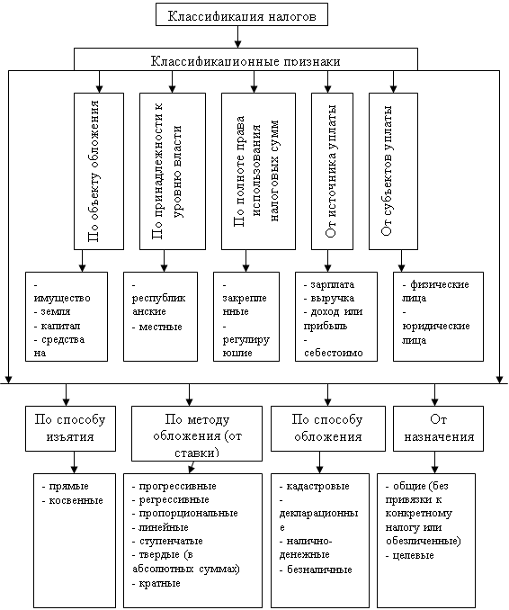 Рис. 1.1 Классификационный состав налогов Группирование налогов необходимо как для упрощения налоговых расчетов, составления отчетности с использованием машинной обработки данных, так и для проведения научно-практических исследований. Пользуясь такой классификацией, можно определить роль каждого налога и налоговой группы по отношению к республиканскому и местным бюджетам, к финансовому состоянию как налогоплательщиков, так и государства. Это облегчает систематизацию учета налогов и налоговых групп. Общепринято начинать классификацию налогов с подразделения их на прямые и косвенные. В основе деления лежат особенности объектов обложения и характер взаимоотношений плательщика и государства. Прямые налоги устанавливаются непосредственно не доход и имущество. К косвенным относятся налоги на товары и услуги, включаемые в отпускную цену. В среде ученых и практиков идут дискуссии по поводу приоритетов прямого либо косвенного налогообложения. Как правило, превалирует точка зрения о том, что косвенные налоги в наибольшей степени несут фискальную функцию, что сдерживает экономический рост, и, следовательно, необходимо увеличивать долю прямых налогов в доходах бюджета. В зависимости от распределения взысканных сумм между бюджетами различных уровней налоги делятся на закрепленные и регулирующие доходные источники. Закрепленными называют налоги, которые на длительный период полностью или в определенной части закреплены как доходный источник конкретного бюджета. Например, подоходный налог является доходом местного бюджета. Регулирующие источники ежегодно перераспределяются между бюджетами различных уровней с целью покрытия дефицита. В качестве регулирующих в Республике Беларусь используются акцизы, НДС, налог на прибыль. Распределение сумм этих налогов между различными бюджетами происходит при утверждении республиканского бюджета на конкретный год. По степени компетенции органов власти различных уровней в отношении решения вопросов установления и введения в действие налогов выделяют государственные (республиканские) и местные налоги. Установление и введение в действие государственных налогов осуществляется решением высшего представительного органа государства в форме закона. Это не означает, что эти налоги обязательно поступают в центральный бюджет. Они могут зачисляться в бюджеты различных уровней. Например, в Республике Беларусь к таким платежам можно отнести НДС, налог на прибыль, акцизы. Местные налоги могут устанавливаться как высшим представительным органом, так и соответствующим местным органом власти, но вводятся они только решением, принятым на местном уровне (в республике Беларусь к таким платежам можно отнести налог с продаж, сборы за услуги и т.д.). Эти налоги всегда поступают в местные бюджеты. Число таких налогов в отдельных странах колеблется от 20 до 100, а их удельный вес в общих доходах местных бюджетов – от 30 до 70 %. [6, стр. 36] В некоторых странах, например, США, Швейцария, к местным налогам относятся и налоги, взимаемые местными властями в виде надбавок к налогам, закрепленным за вышестоящими бюджетами. Налоги по порядку их использования подразделяются на общие и целевые. Общие налоги обезличиваются и поступают в бюджет для финансирования общегосударственных мероприятий. Целевые налоги